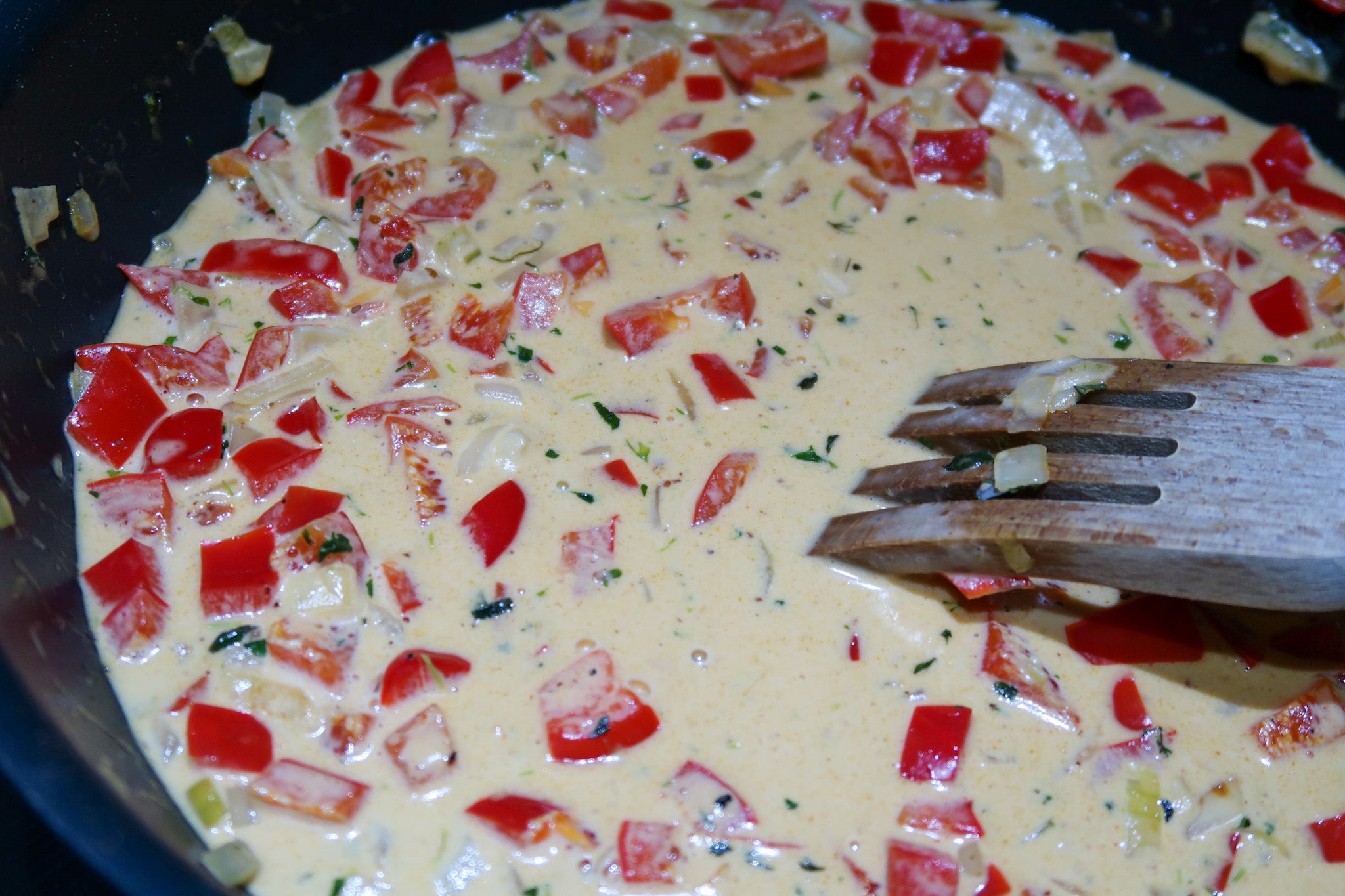 2) Hacka paprika och lök. Lägg i det där du stekte köttet. Stek runt tills löken och paprika mjuknar. Ha i dijonnaise , pressa i vitlök, hackad timjan, kalvfond och grädde. Rör runt och låt puttra i några minuter.