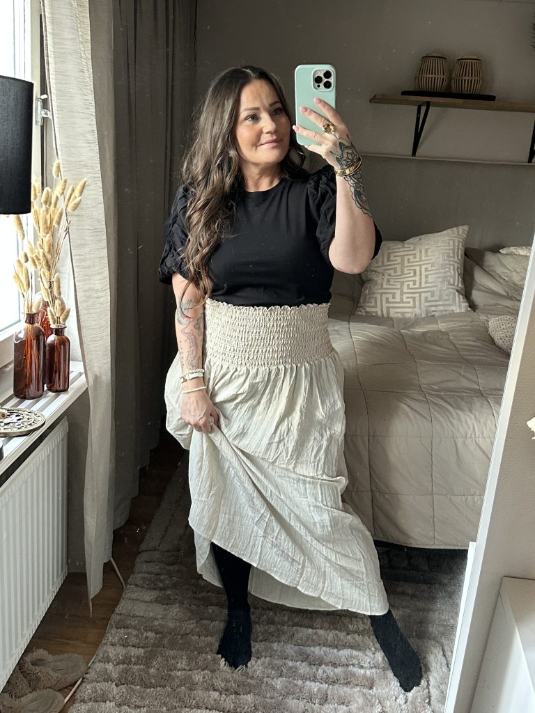 En så skön topp alltså, mjuk och följsam. Blir glad av den, känns lite 70 tal. Kjolen är en stor favorit, använder massor! Resår i midjan så den sitter väldigt skönt på!