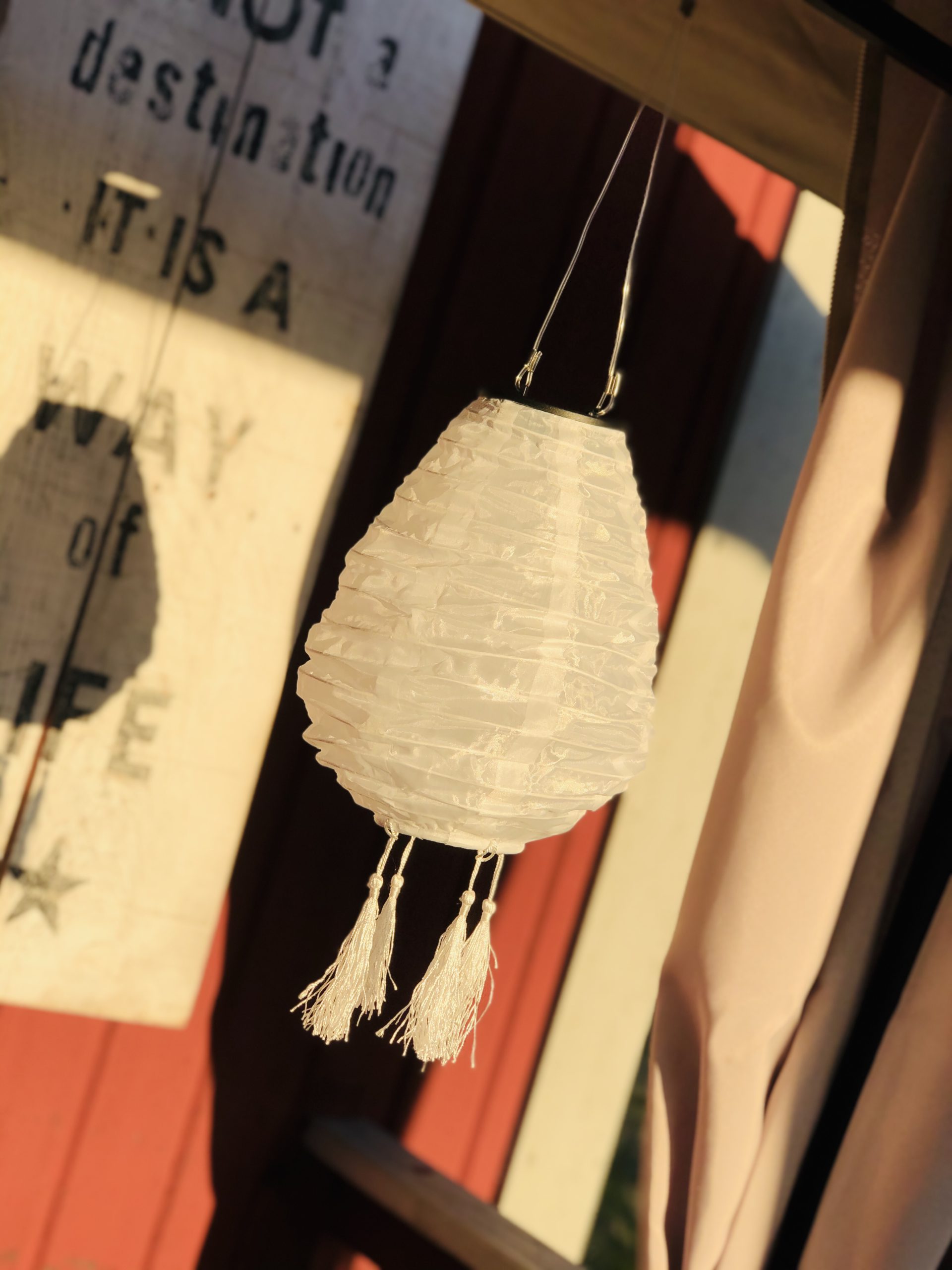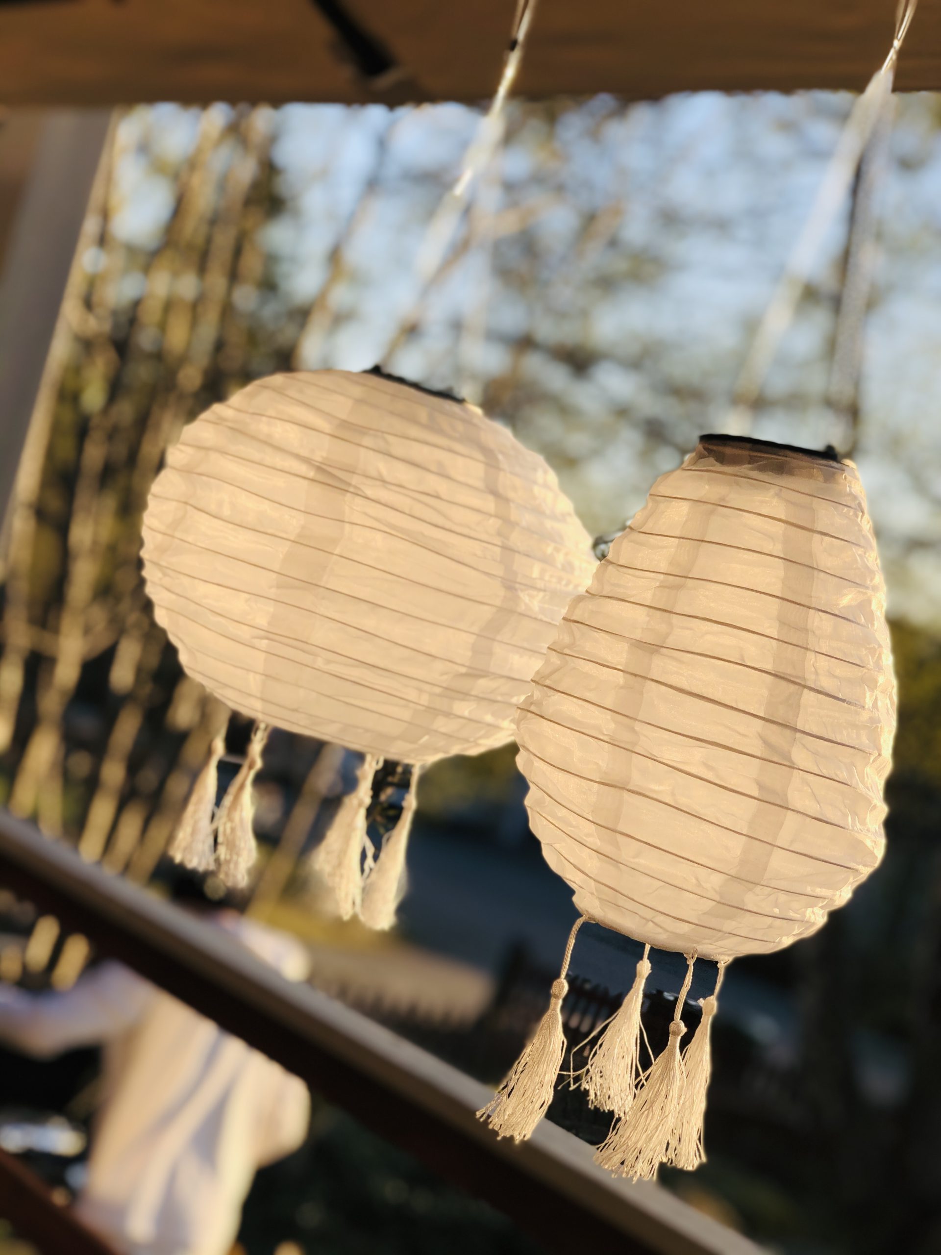 Igår fick jag upp dessa solcellslampor i paviljongen. De ska lysa upp på kvällen när det börjar bli mörkt. Mysigt mysigt…. jag gillar ju det där lite bohemiska jag och bara älskar att det är små tofsar på dessa lampor.
