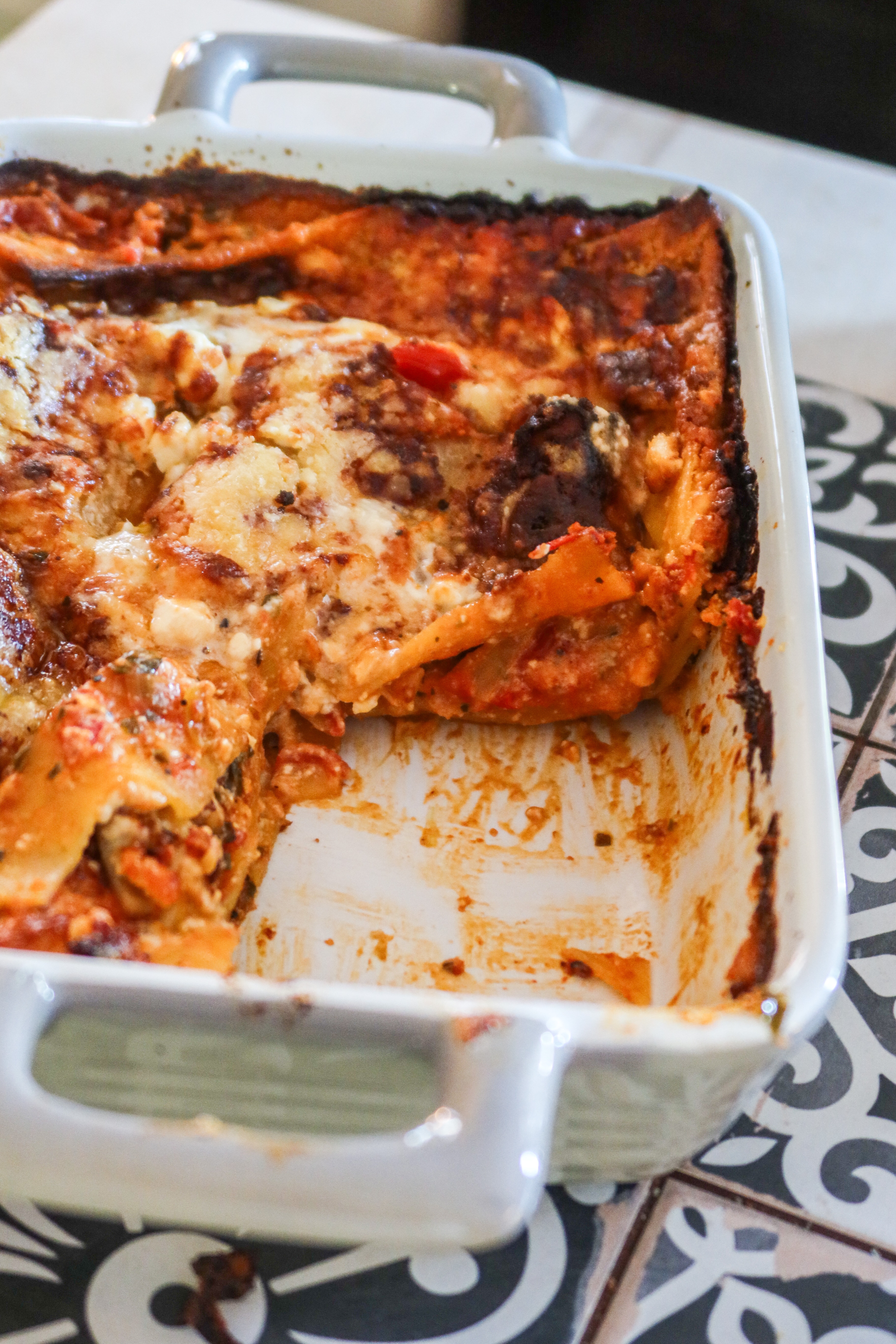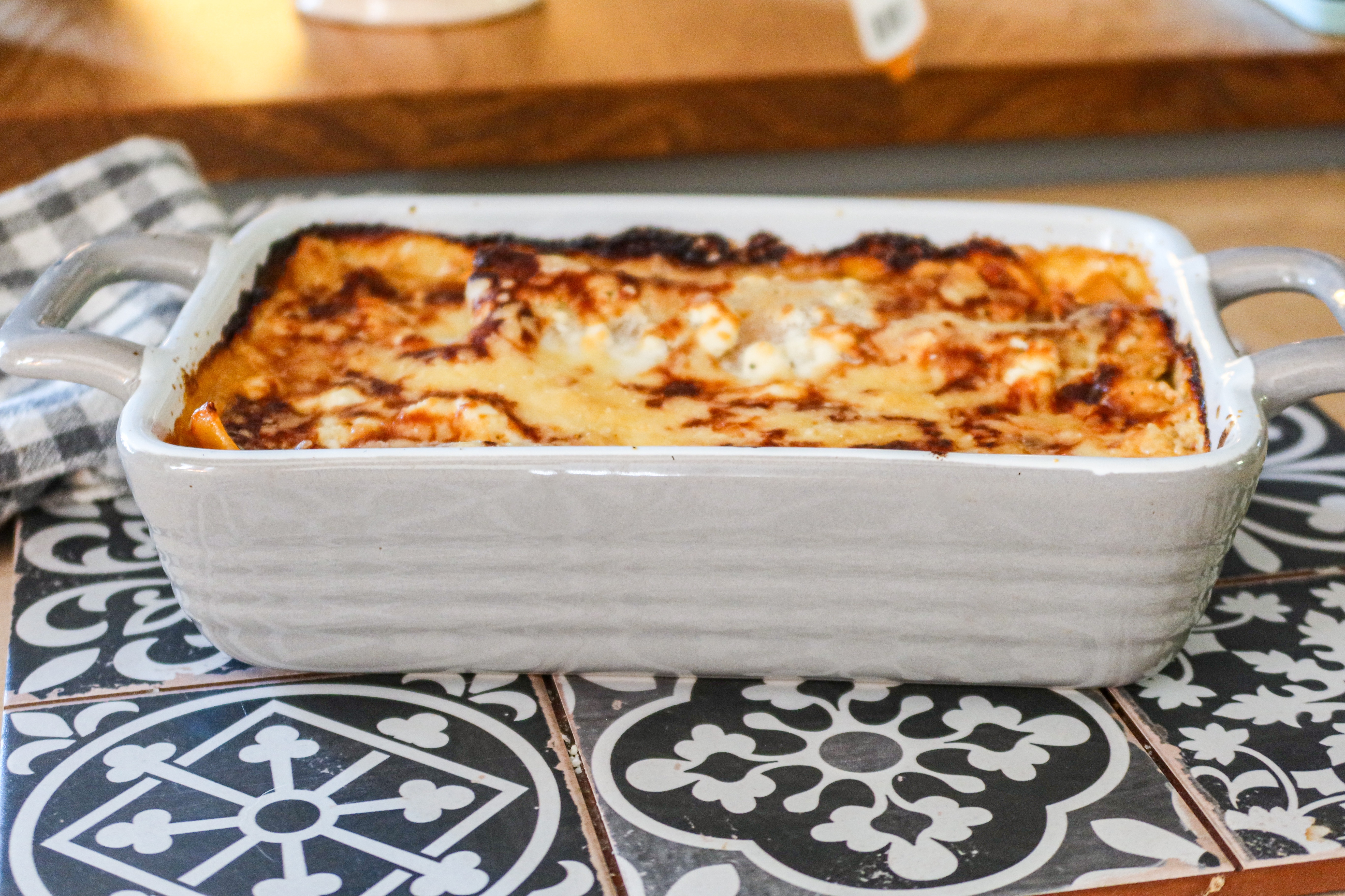 4) Ta fram en ugnsform på ca 20×15 cm. Börja med att ha i grönsaksröran i botten. Fördela ut lasagneplattor så de passar som nästa lager. Därefter varvar du med fetaoströran uppepå. Sedan på med lasagneplattor igen. Så gör du och avslutar sist med fetaoströran och riven ost uppepå det.