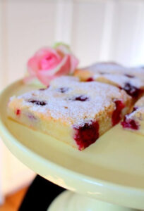 2) Smörj och bröa en form på ca: 20×25 cm och häll i smeten där. Strö över hallonen över smeten.