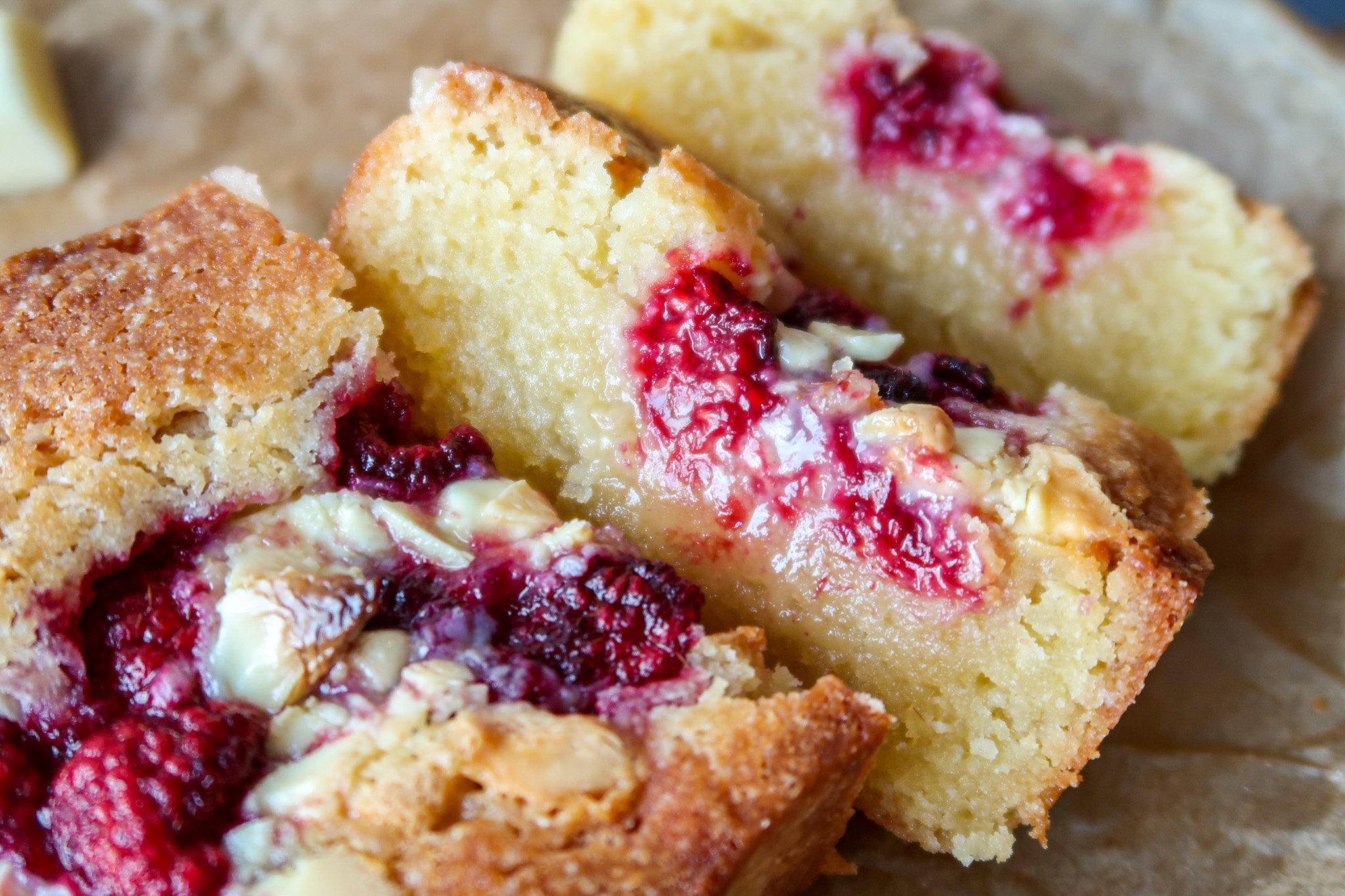 4. Klä en brödform på ca 1 – 1,5 l med bakplåtspapper. Häll i smeten. Ha i hallonen i mitten av kakan och avsluta med att hacka på lite vit choklad.