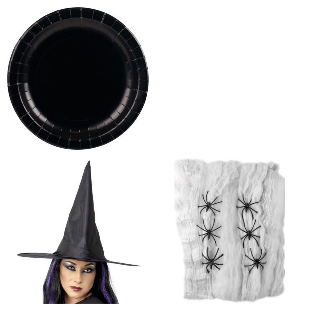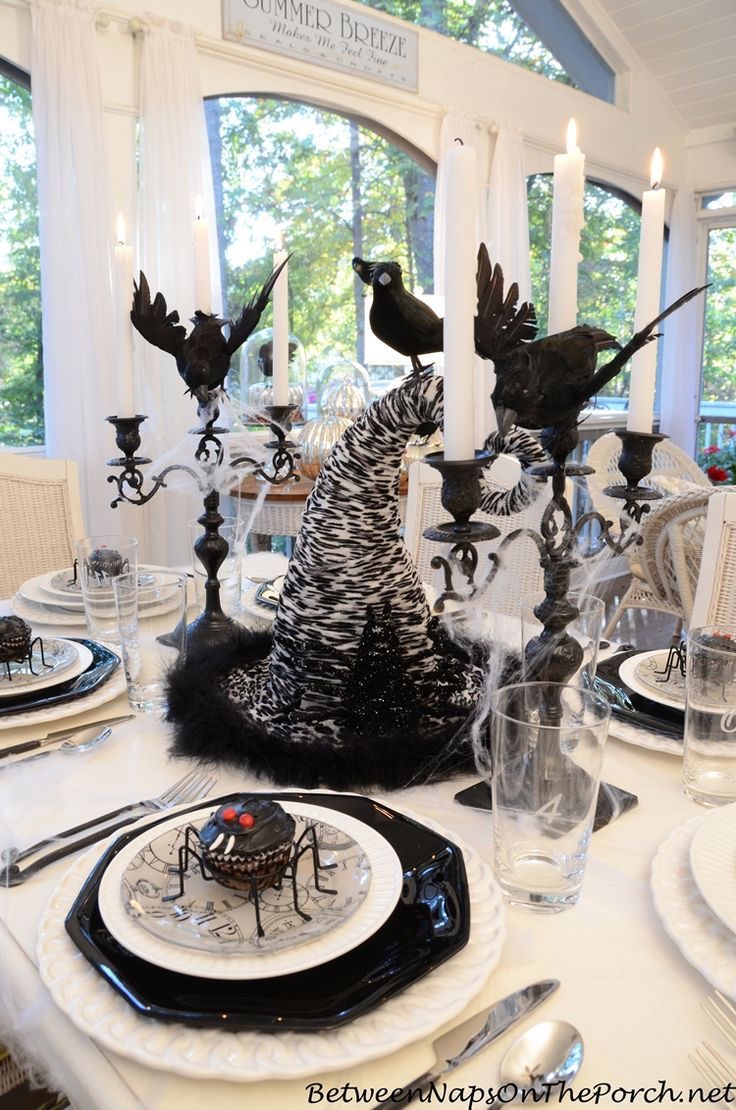 Här har en häxhatt får vara ”centerpiece” på en dukning. Lite svarta tallrikar och spindelväv så har du en fantastisk dukning.