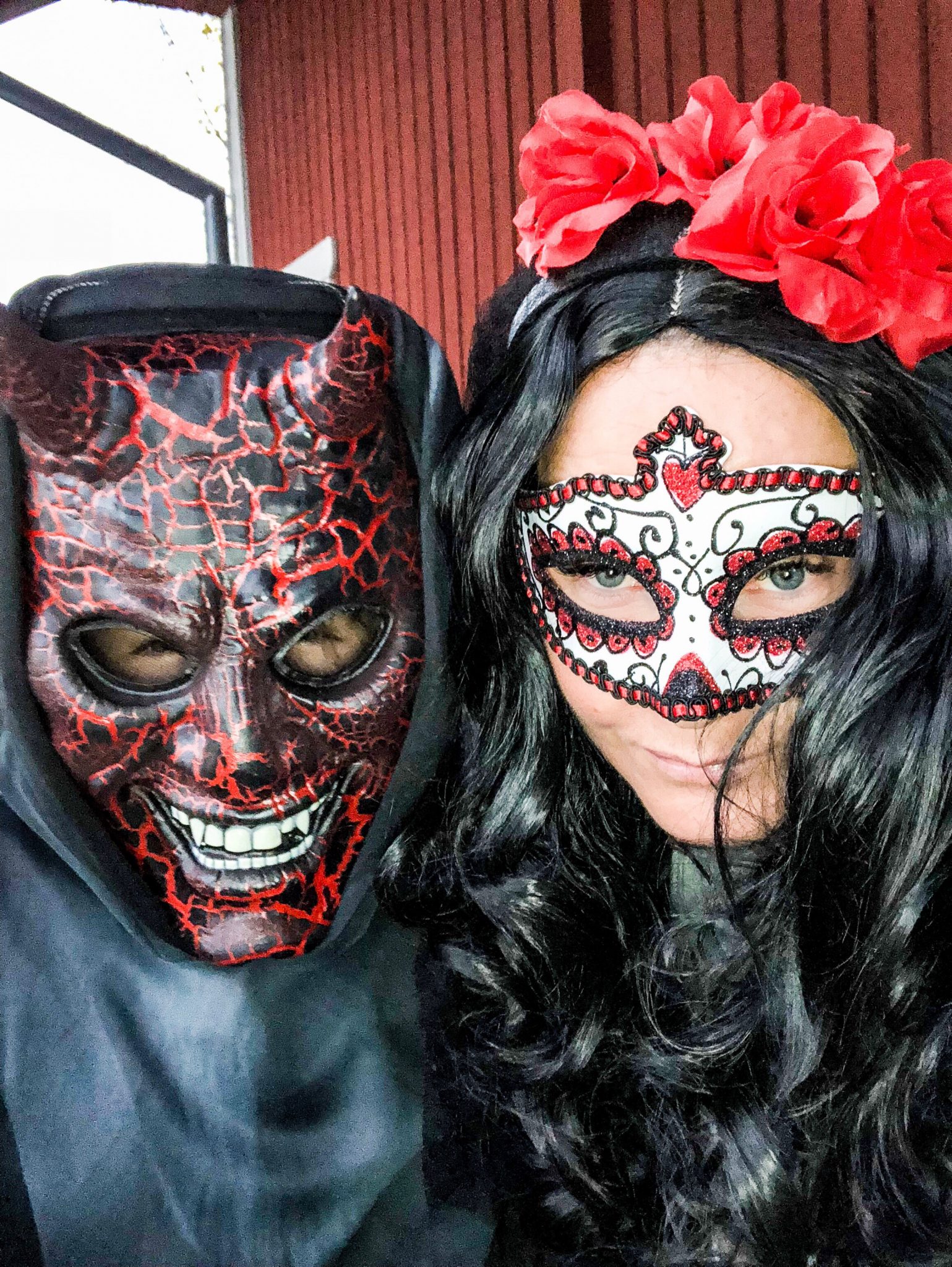 Mamman har självklart också en dräkt. Jag och Tony ville vara Day of the dead figurer. Om du sett den tecknade filmen Coco så vet du hur de ser ut. Jag vet inte om jag ska den här masken med tillhörande diadem med blommor och slöja eller om jag ska sminka mig själv?