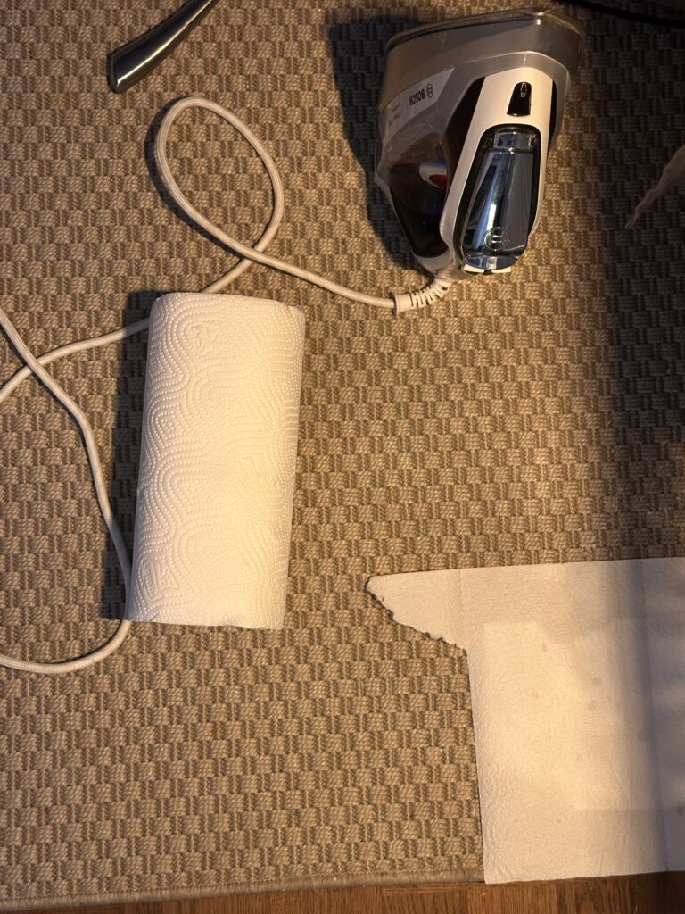 Man behöver hushållspapper (en del använder bakplåtspapper eller kaffefilter), strykjärn och lite tålamod. Lägg hushållspappret på mattan, sedan stryker du över pappret. Du kan riktigt se hur stearinet smälter och sugs in i pappret. Sedan när hushållspappret verkar fullt, byt papper och fortsätt.