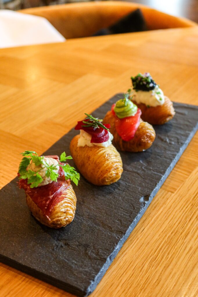 Fick smaka deras fantastiskt goda hasselbackspotatis. En med smetana, en med lax, en med rödbeta och en med kött. Så himla gott!