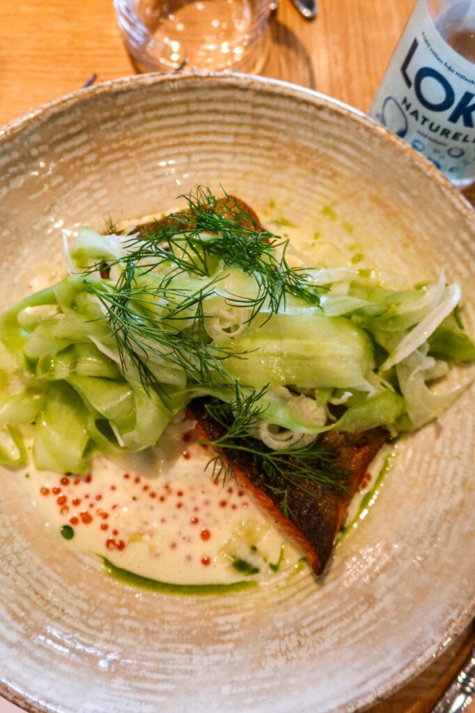 Jag åt röding med fänkålssallad och Sandefjordssås, väldigt gott och fräscht med salladen till. En liten pralin till kaffet blev det också. Fanns koffeinfritt kaffe och jag fick också skummad havremjölk till. Så fint!