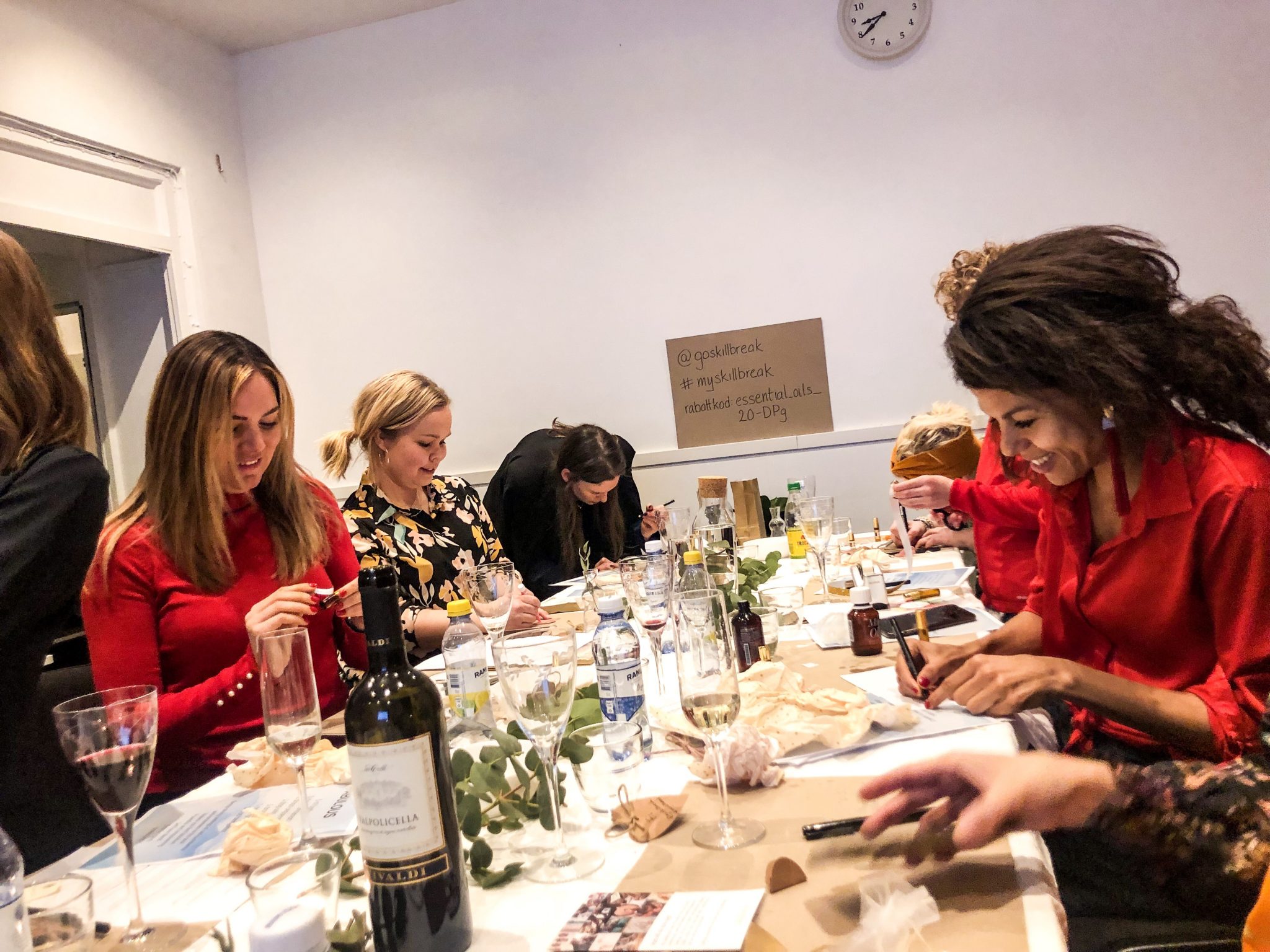 Det var ett väldans sniffande sen när vi skulle göra våra egna eteriska oljor. Alla gjorde sina egna och så fick vi lite tips på olika sammansättningar. Jag gjorde en som var avstressande och lugnande, sen blev det en som kallades för Fabulous, den var mer uppiggande. Frankincense, alltså woooow vad ja gillade den doften. Jasmin också. Blev alldeles salig.