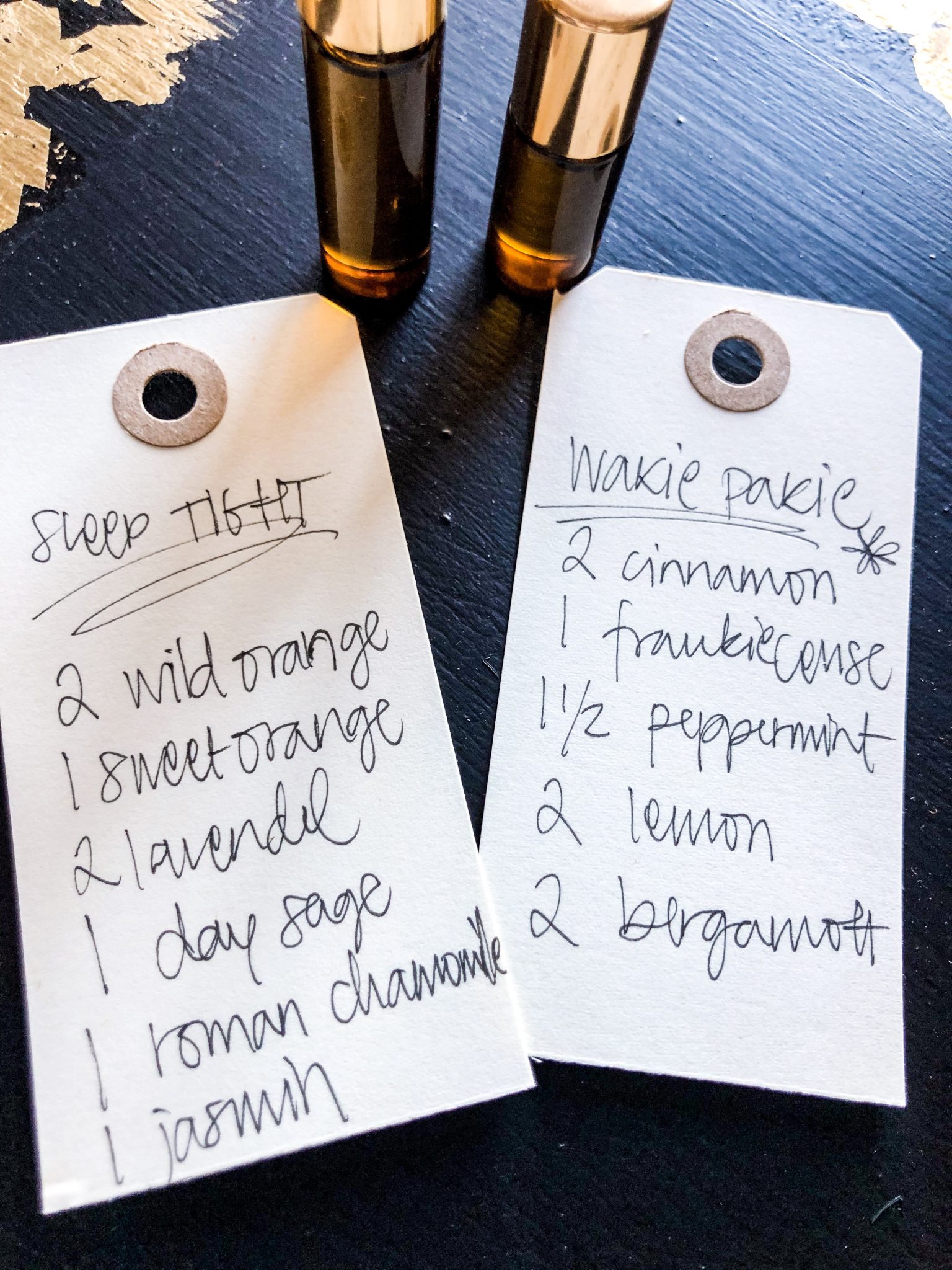 Här har ni mina oljor som jag gjorde. Den kan man ha på sig hur många gånger man vill under dagen och de doftar magiskt gott båda två. Här ovan har ni receptet på min lugnande oljedoft. Den kommer jag nog använda mest så jag gjorde den i den stora, den uppiggande i den lilla.