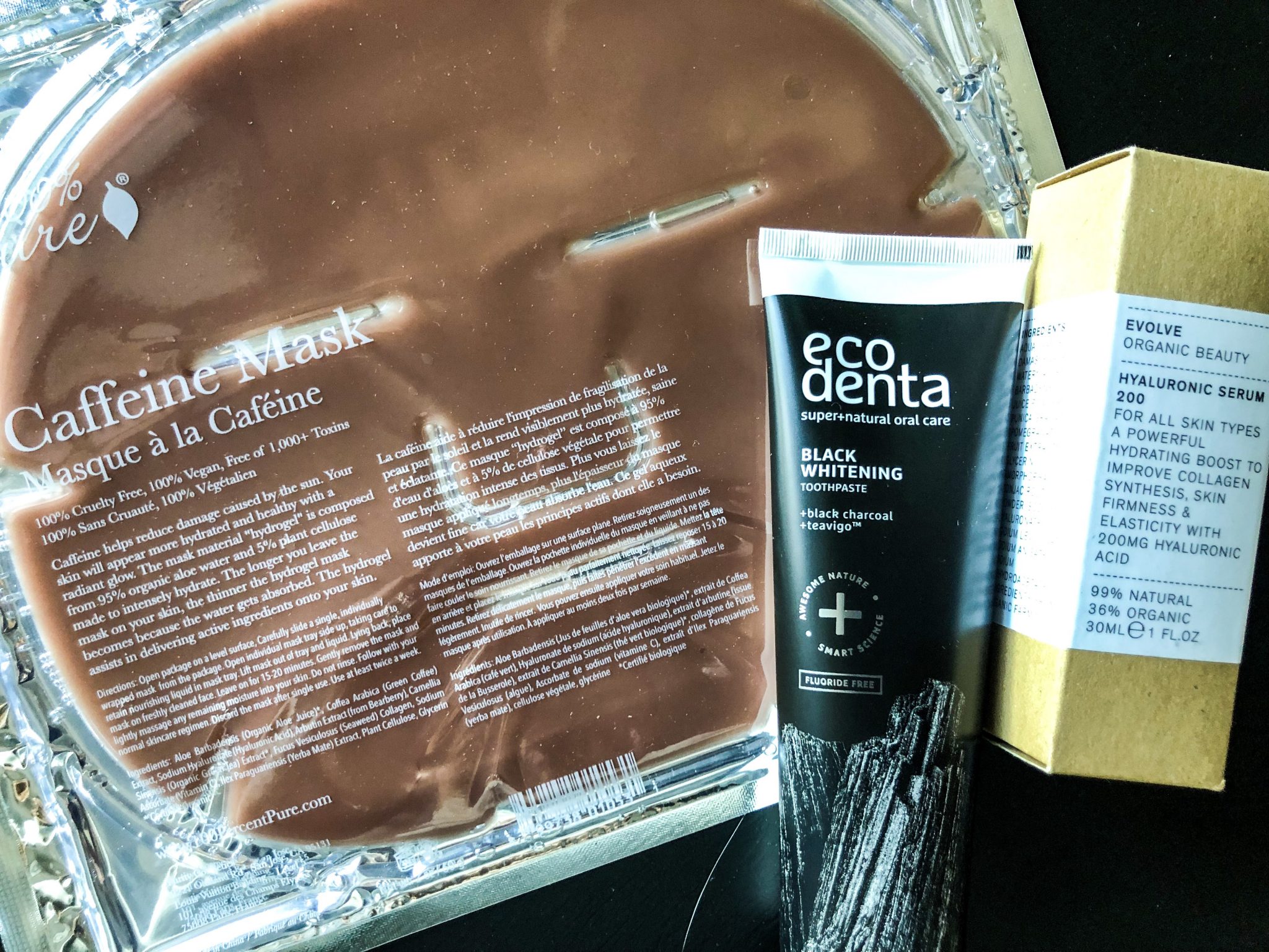 Goodiebagen innehöll en hel del härligheter. Powerbank från Ideal of Sweden, nyttigt godis från Smiling (fick smaka deras kokoschips med havssalt igår och MÅSTE köpa till fredagsmyset idag – så galet gott), serum från Evolve organic beauty, svart blekande tandkräm från eco denta och en koffeinmask.