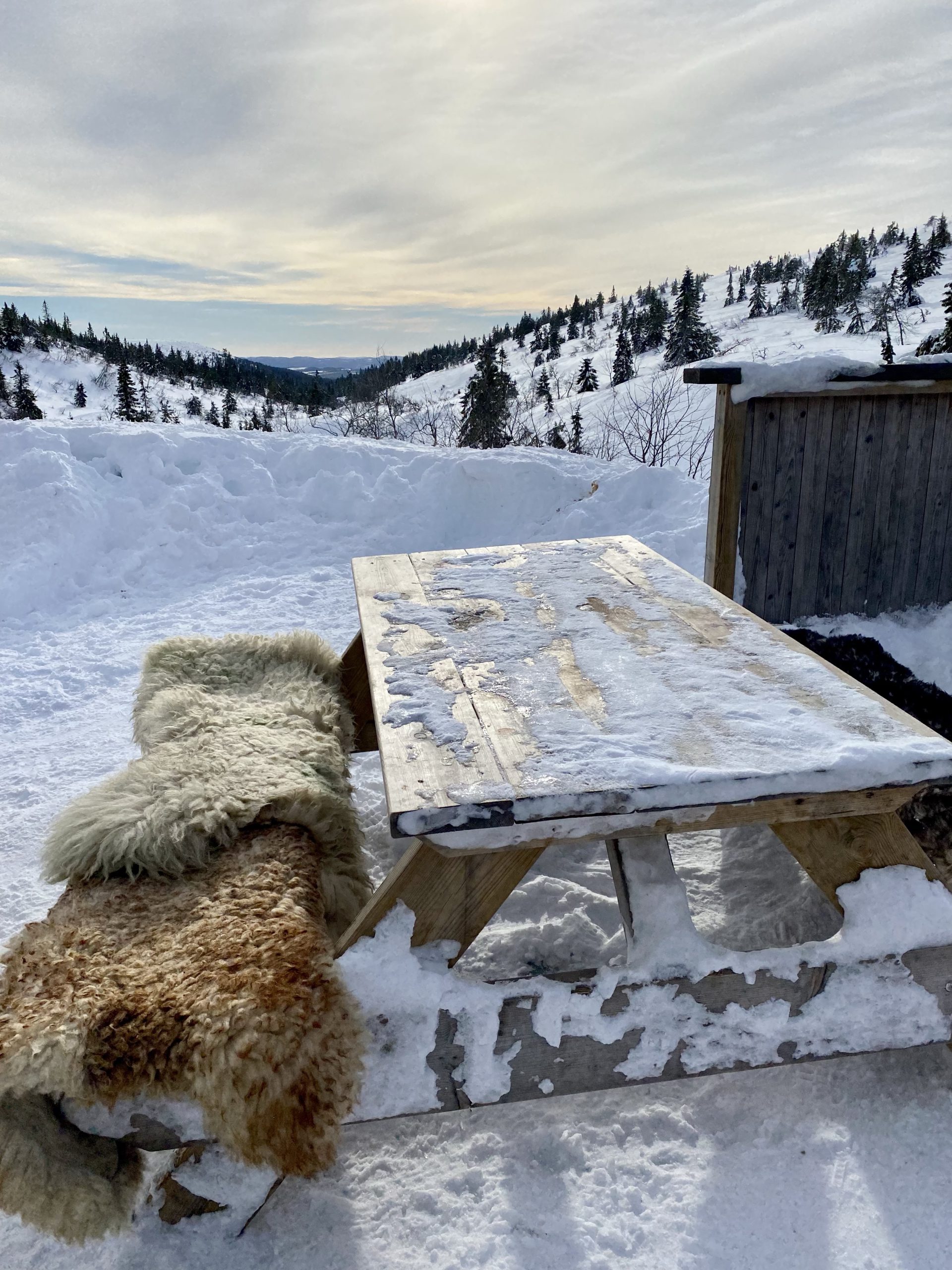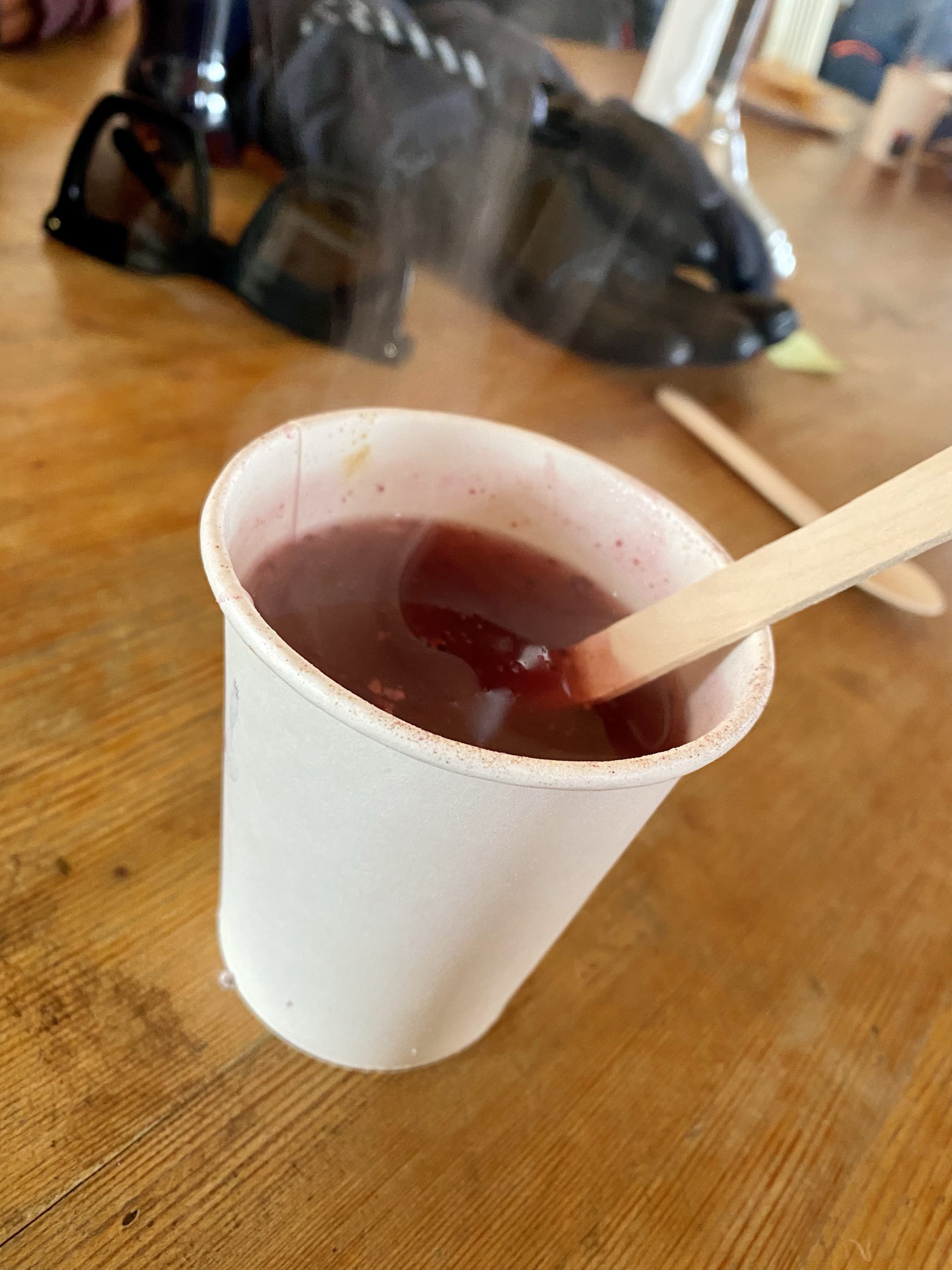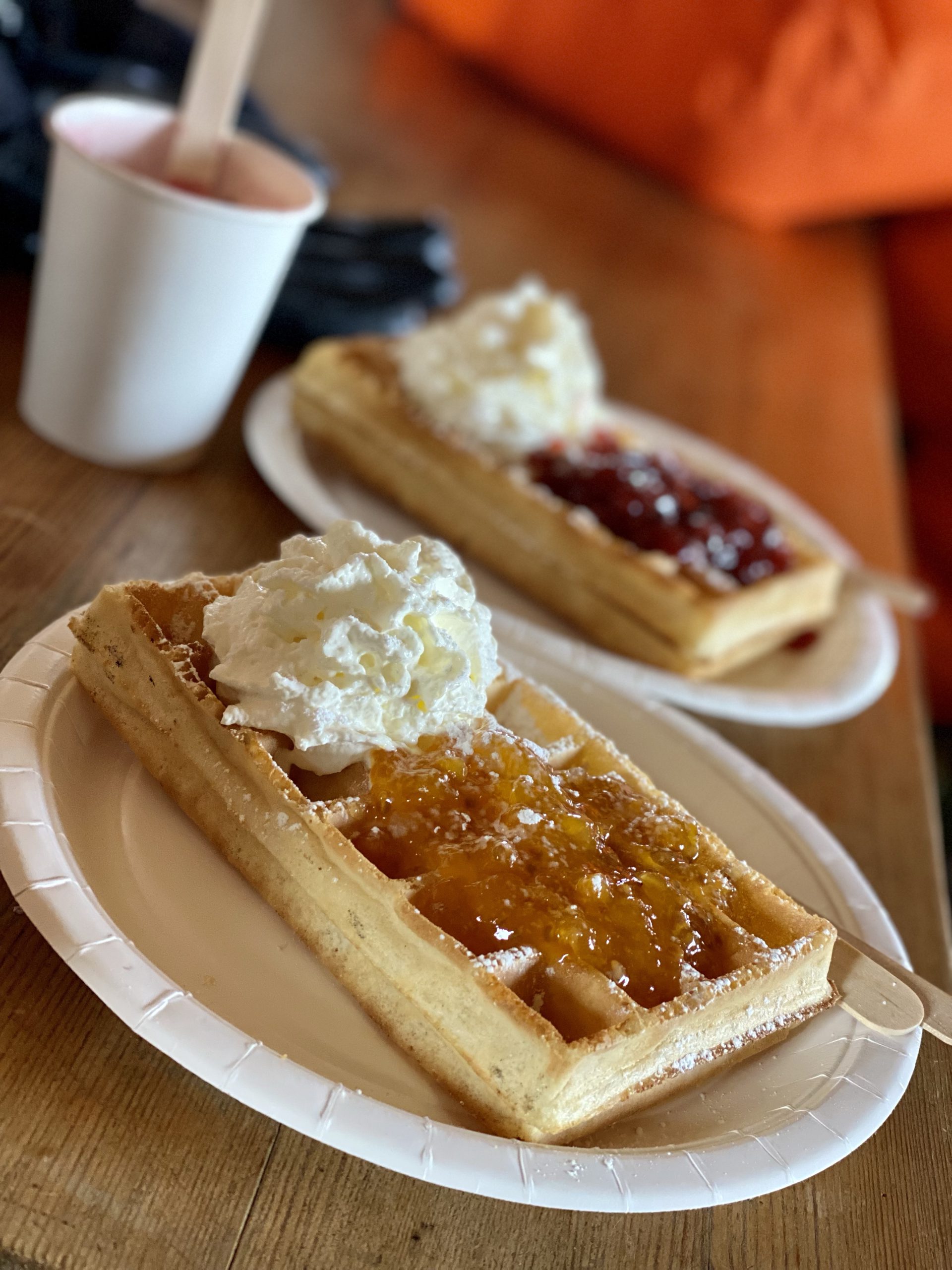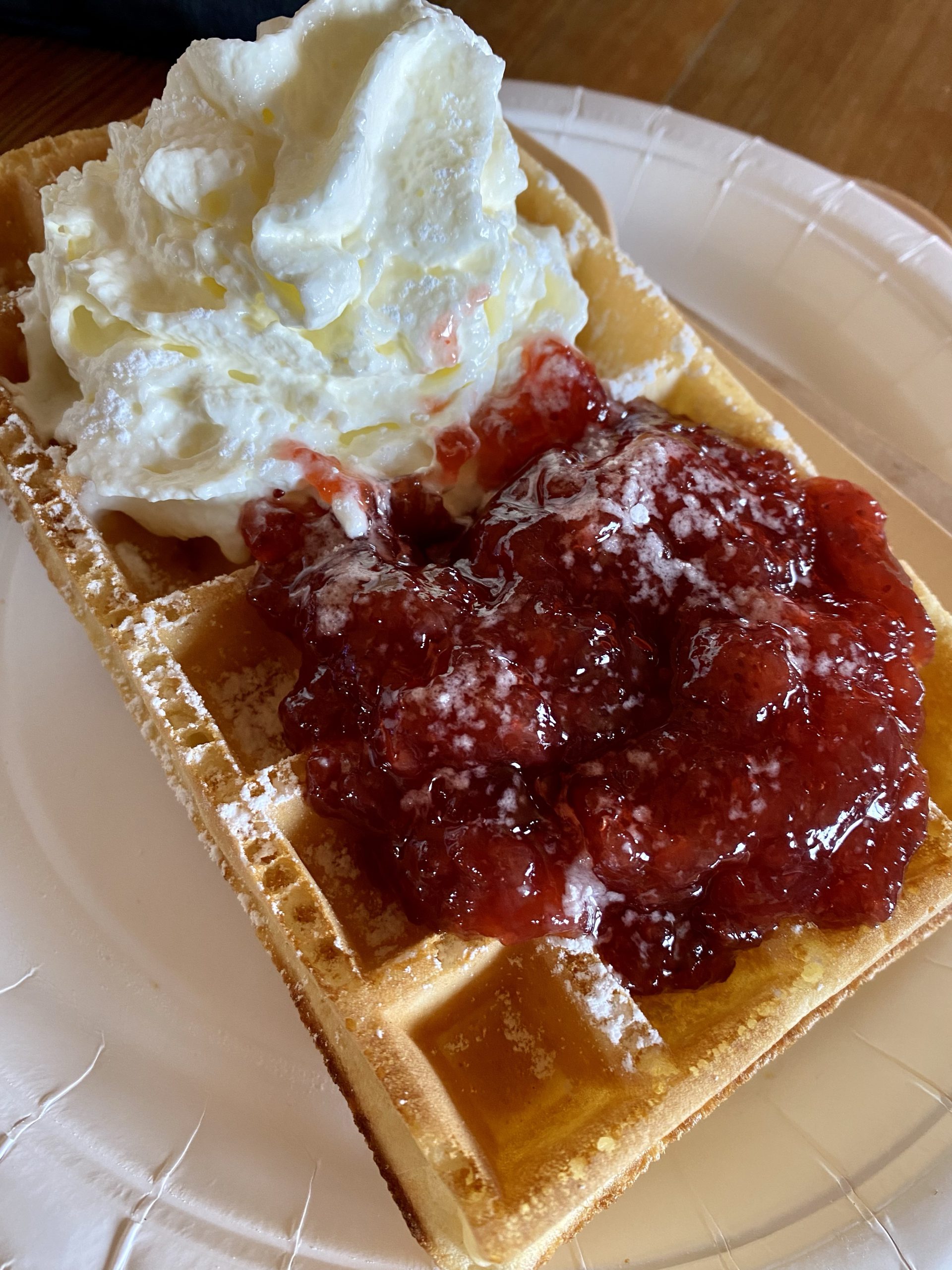 Varm choklad, blåbärssoppa, våfflor med både hjortron och jordgubbssylt. Jag tog två våfflor. Haha, ja men jag är stor i maten. Sen kunde jag inte bestämma mig för jordgubbs eller hjortronsylt. Skulle heller aldrig bli belåten på en sån liten våffla som är mer eller mindre bara luft ju. Ingen annan tog 2 dock….. haha! 🤣