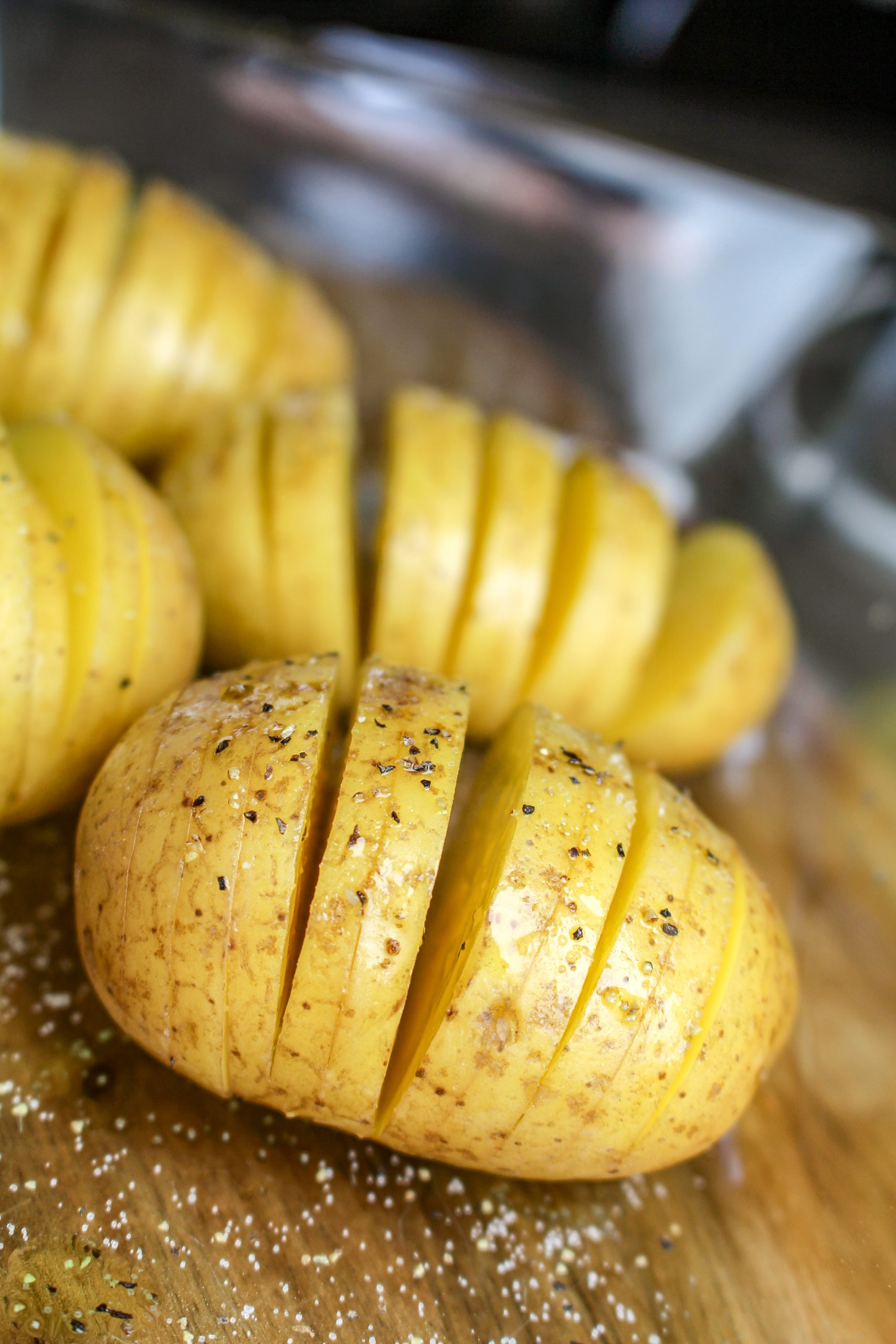 1) Tvätta potatisarna ordentligt. Skiva potatisarna, lämna dock ca 0,5 cm i botten som inte är skuren. Olja in potatisen med olivolja och salta och peppra potatisarna.