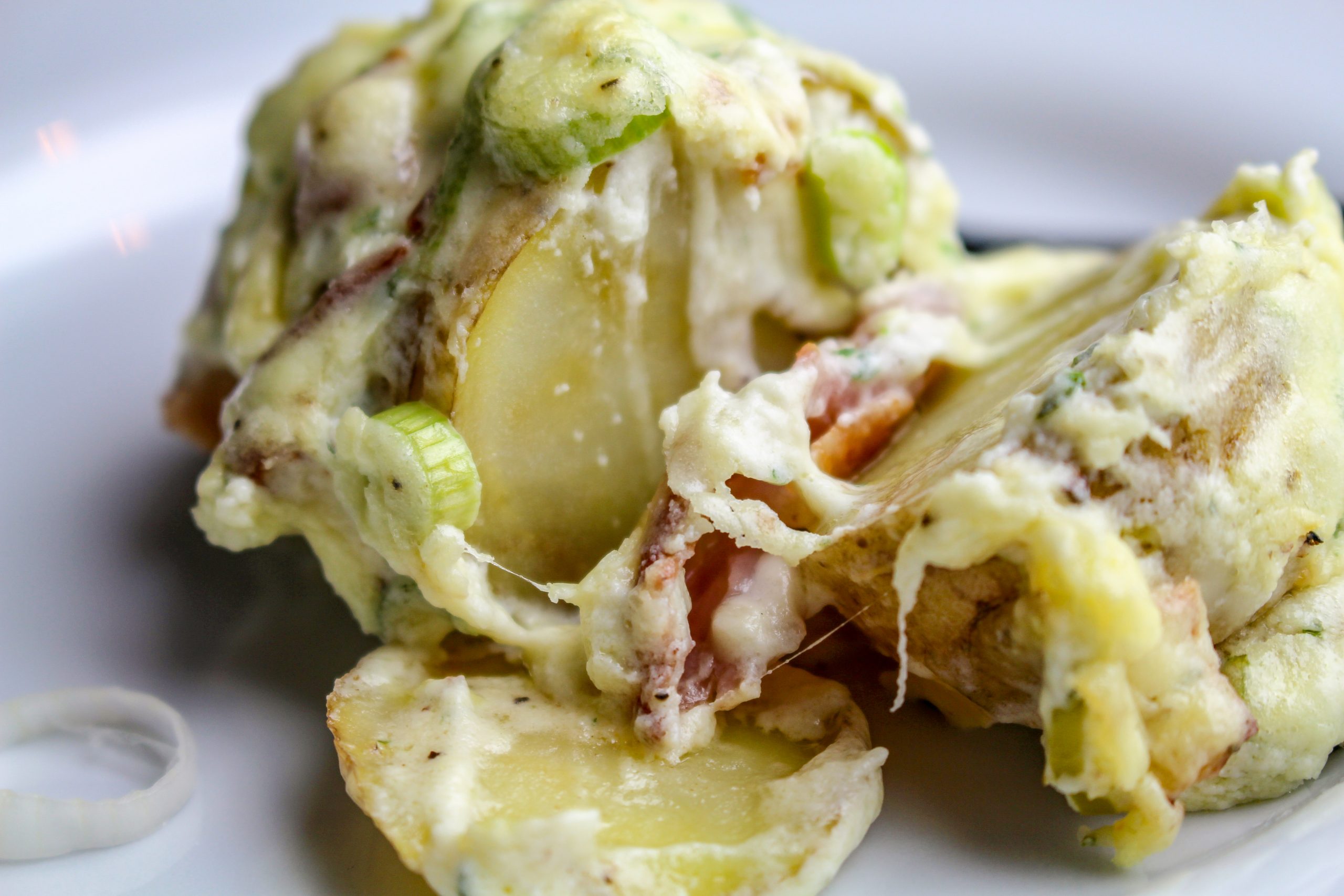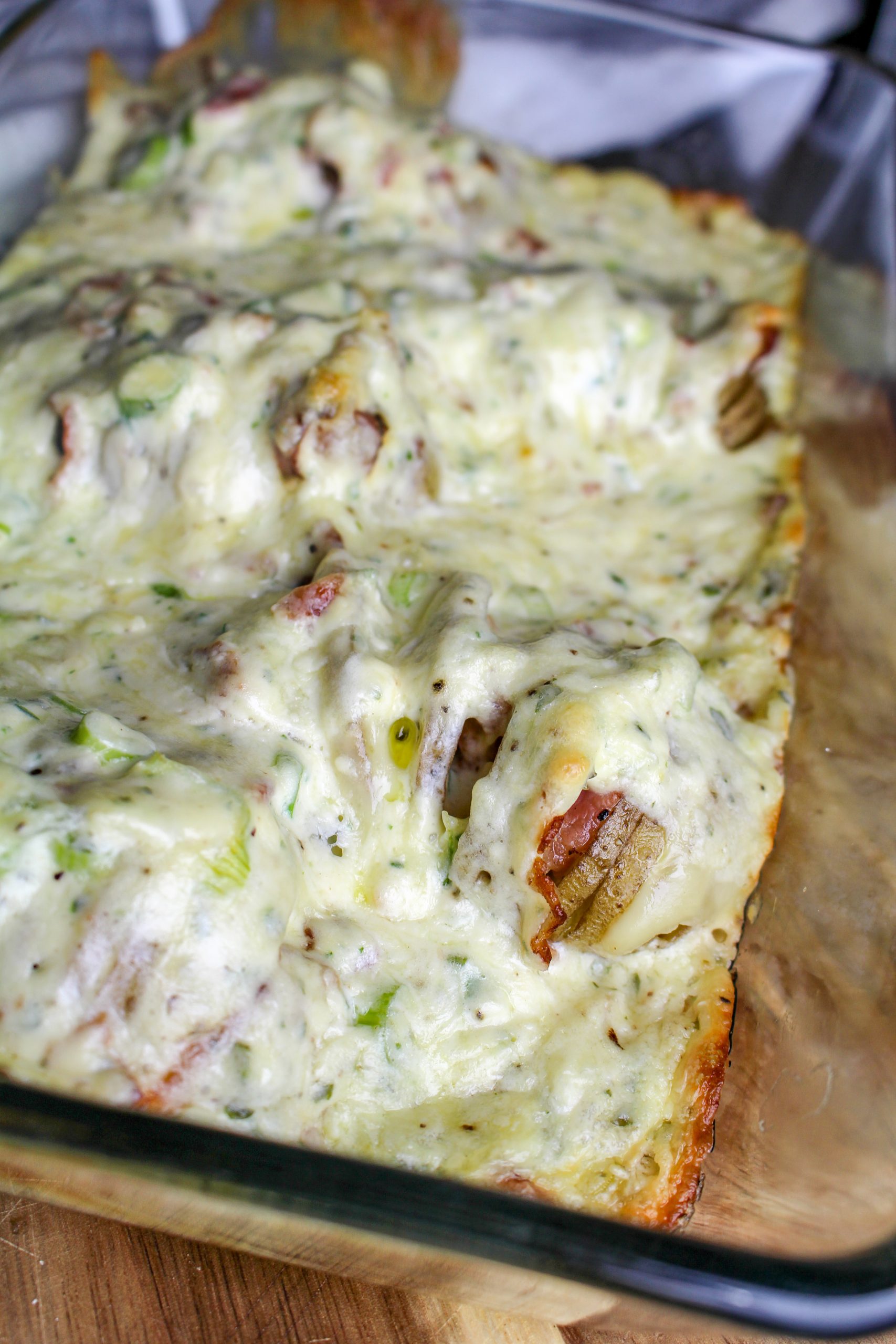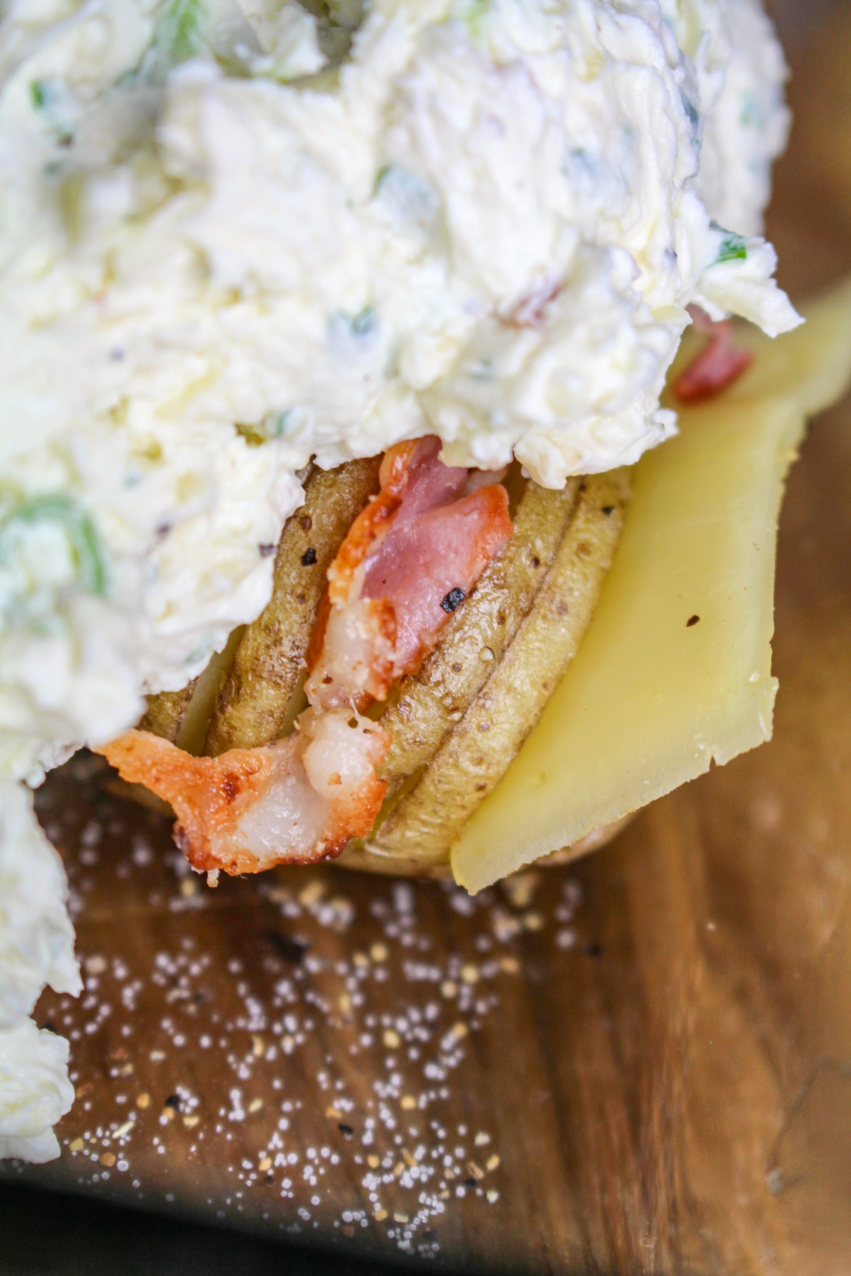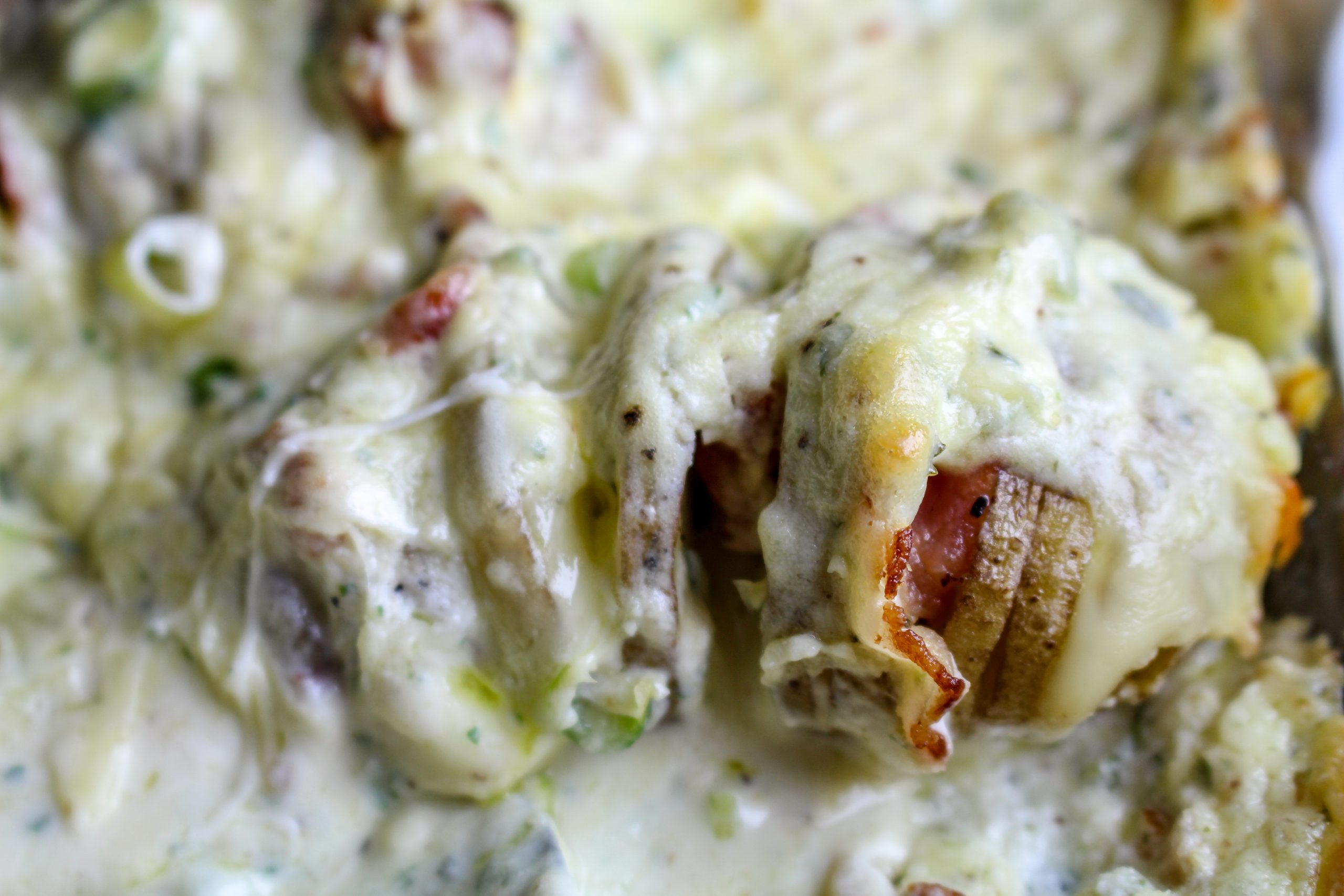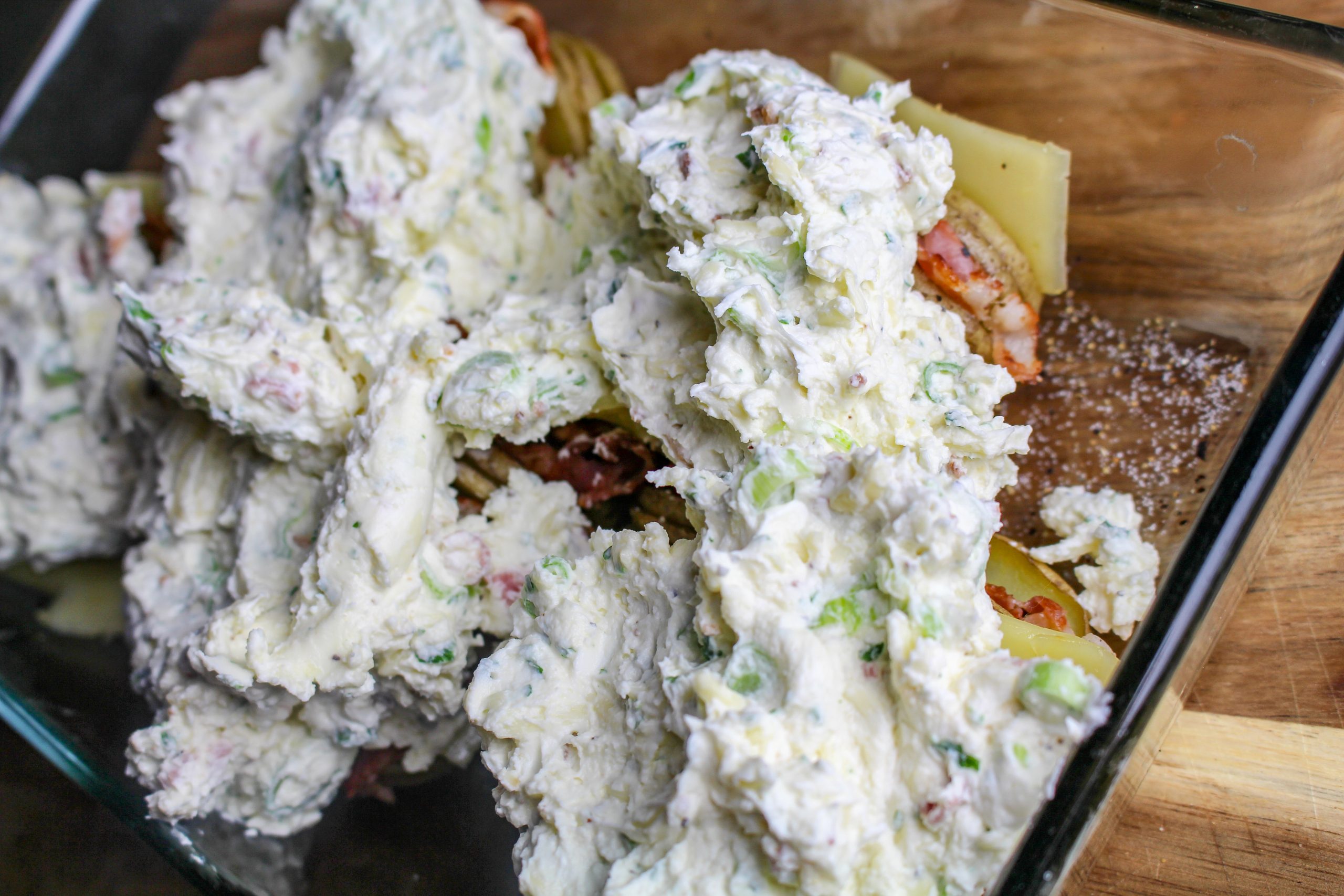 3) Stek baconen. Skiva sedan baconen i skivor. Skiva också ostskivorna i mindre bitar. Stick ned ost och bacon i hallselbacksskivorna. Gör röra på cream cheese, skivad salladslök, riven ost, örter, grädde (eller mjölk), salt och peppar. Bred ut den på potatisarna.