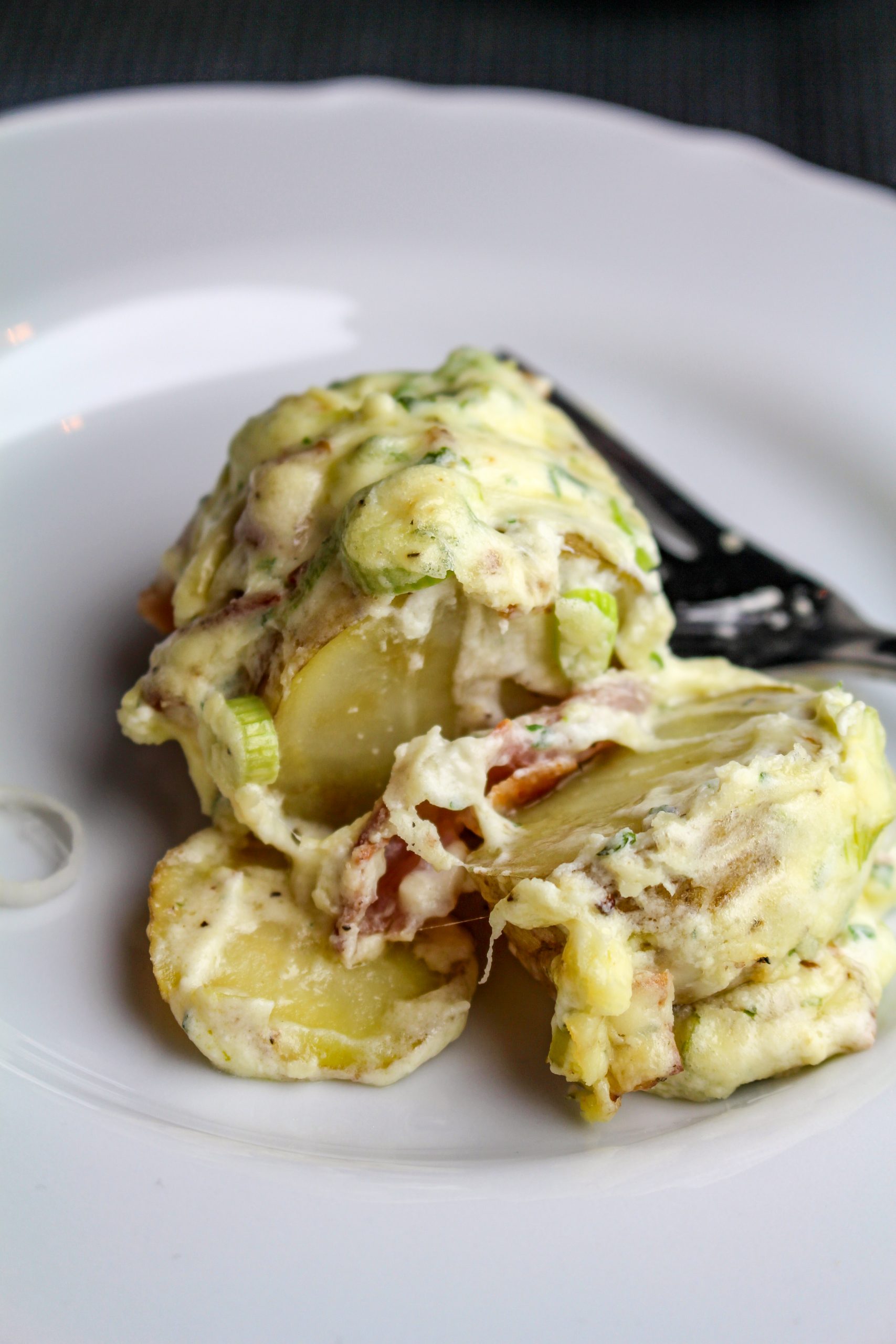 Idag gjorde jag en riktigt smarrig rätt alltså. Hasselbackspotatis i ugn med ett krämigt cream cheesetäcke med bacon, ost och salladslök. Milo åt här precis och tyckte det var supergott. Tony går och trampar här och längtar till vi ska sätta oss och äta och har varit och nallat på det flera gånger och har samtidigt mumlat något om ”fyfasen så gott”. Han var sen hem från jobbet idag så jag väntade in honom men Milo som varit ute och sprungit idag var vrålhungrig och fick käka innan.