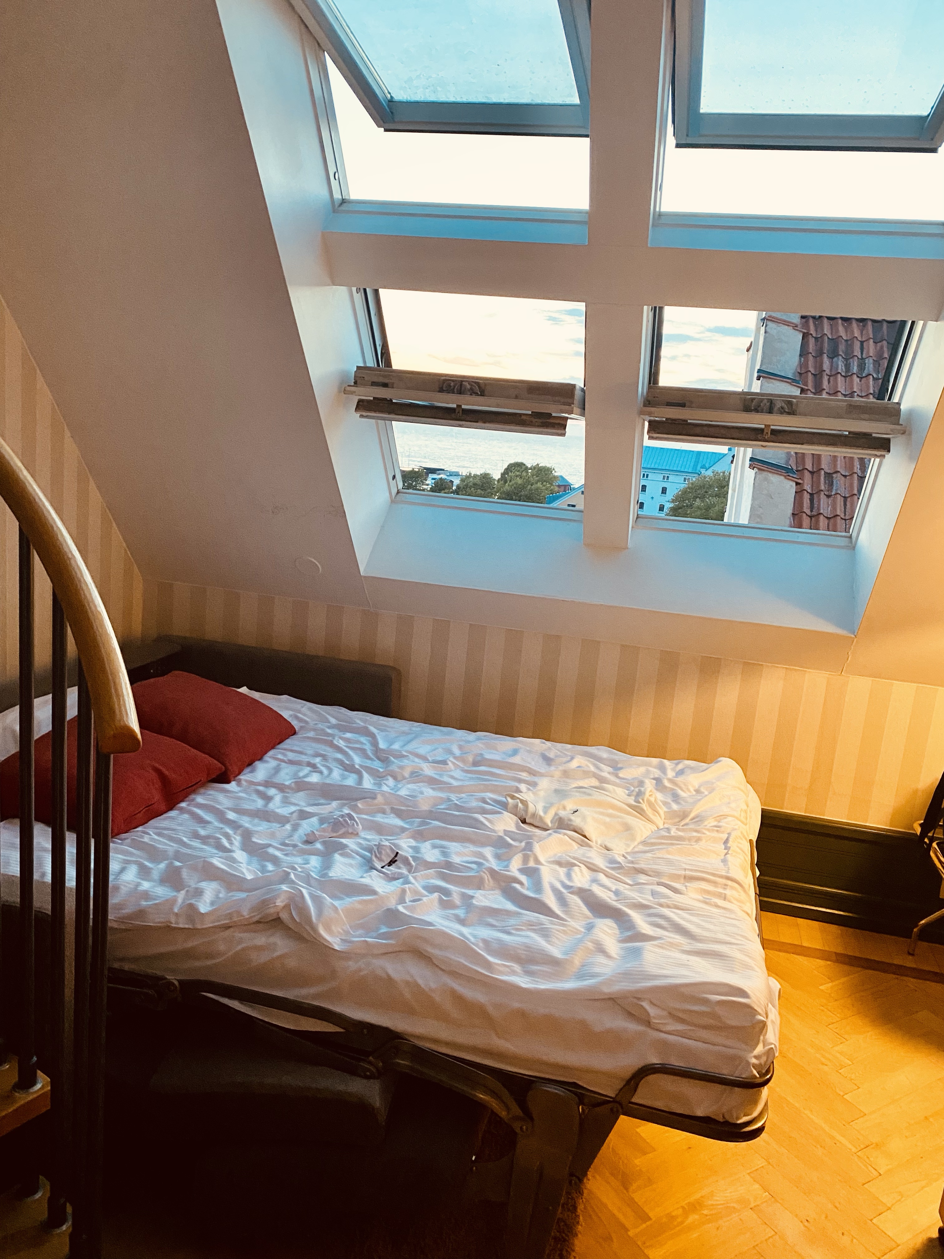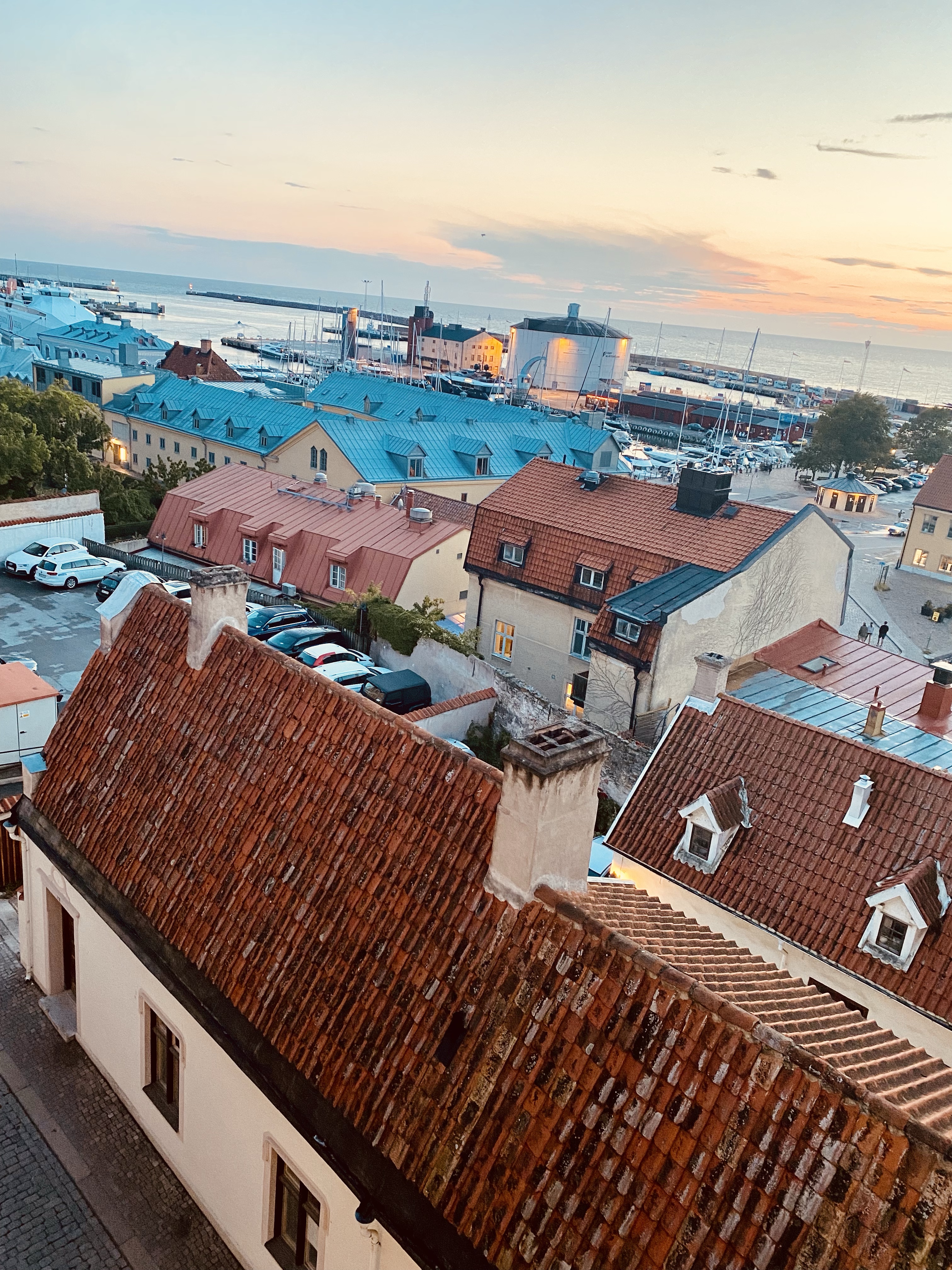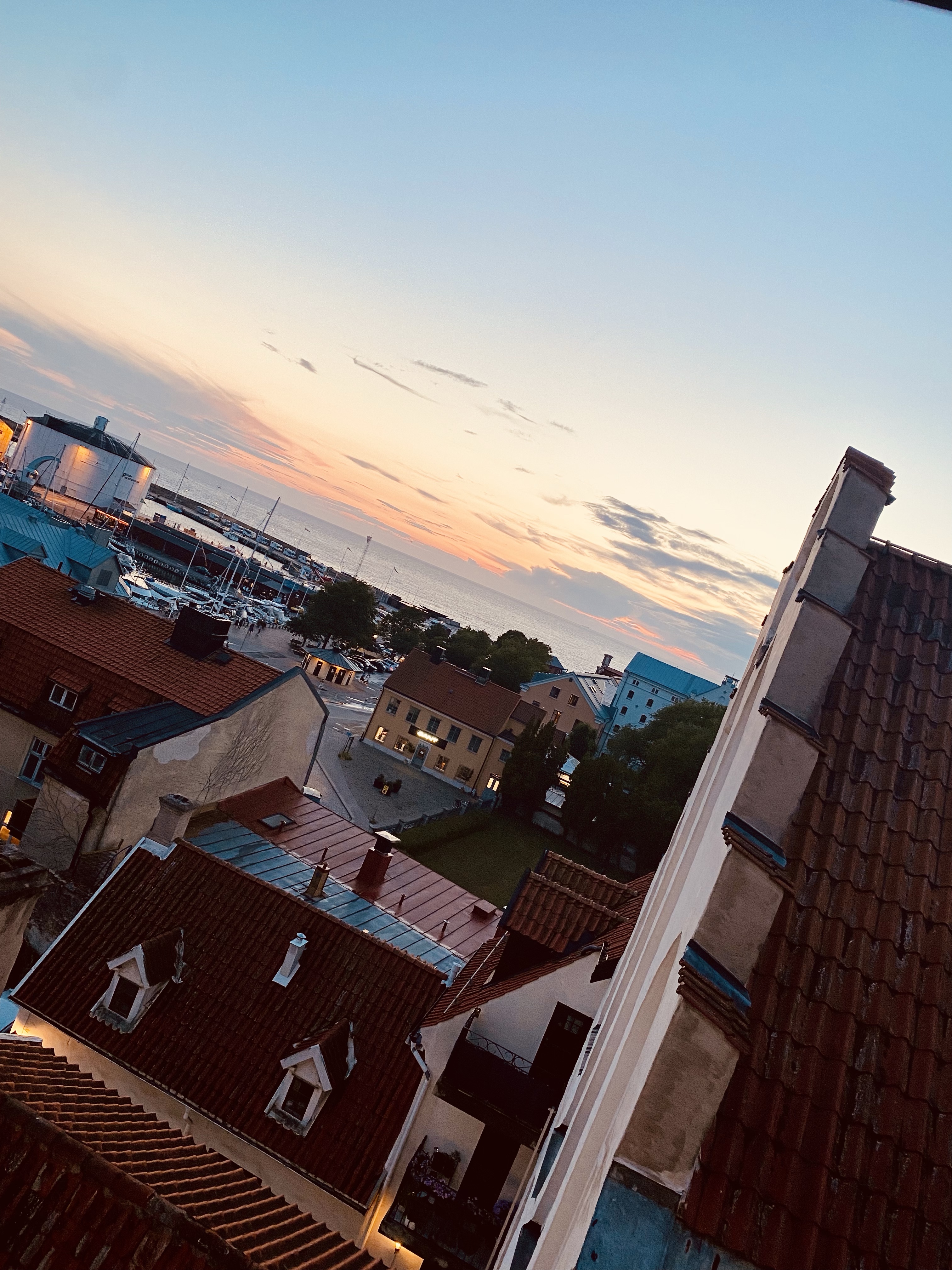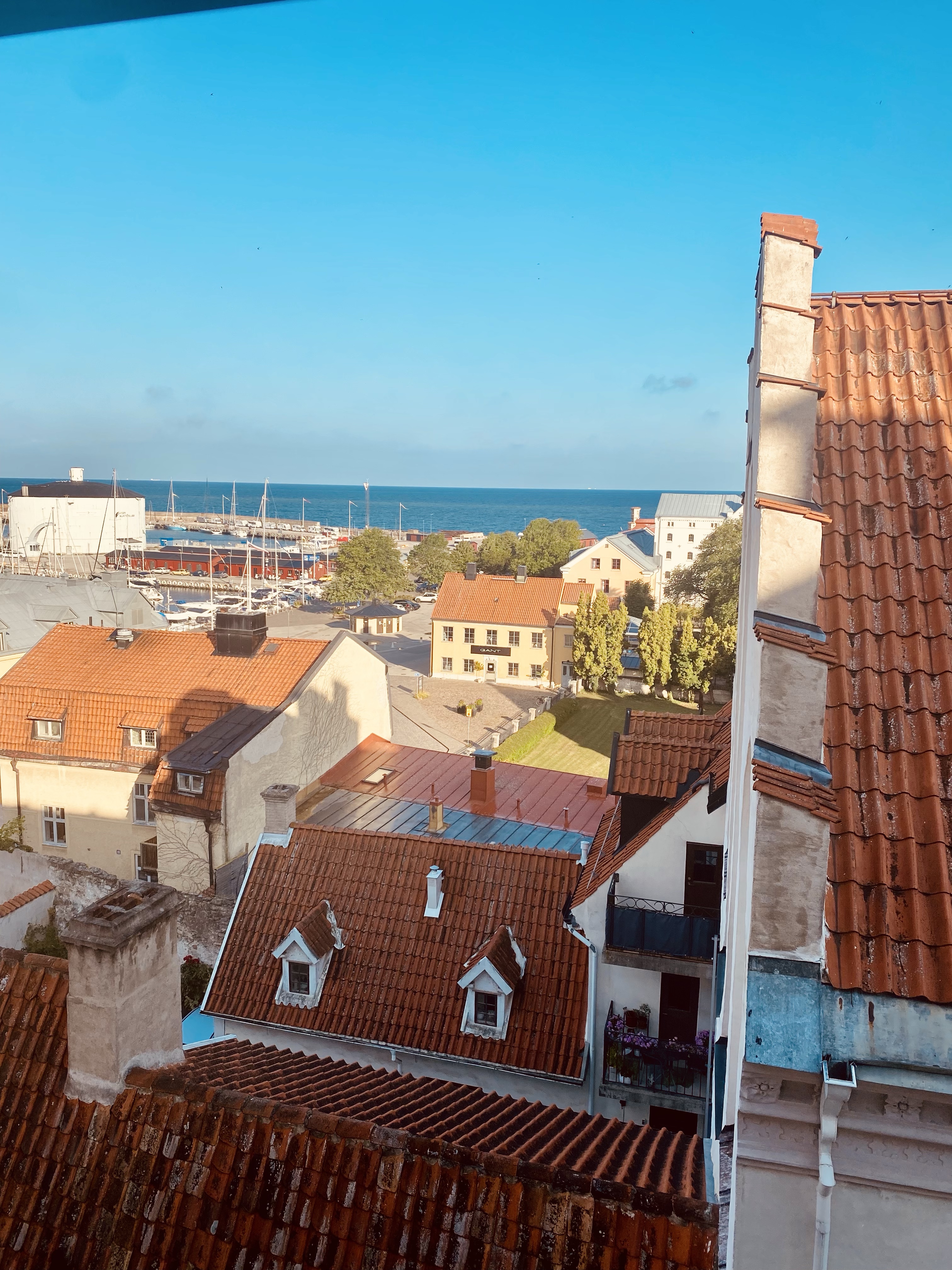 Älskar vårt rum. Bilden här ovan är tagen från våra takfönster. Vi bor på Clarion Wisby. Vårt rum har ett sovloft med dubbelsäng och en bäddbar soffa på nedervåningen. Älskar hotellet. Gjorde research innan vi åkte och tyckte detta lät toppen och bokade det. Idag ska vi prova spa:t då det ska regna här.