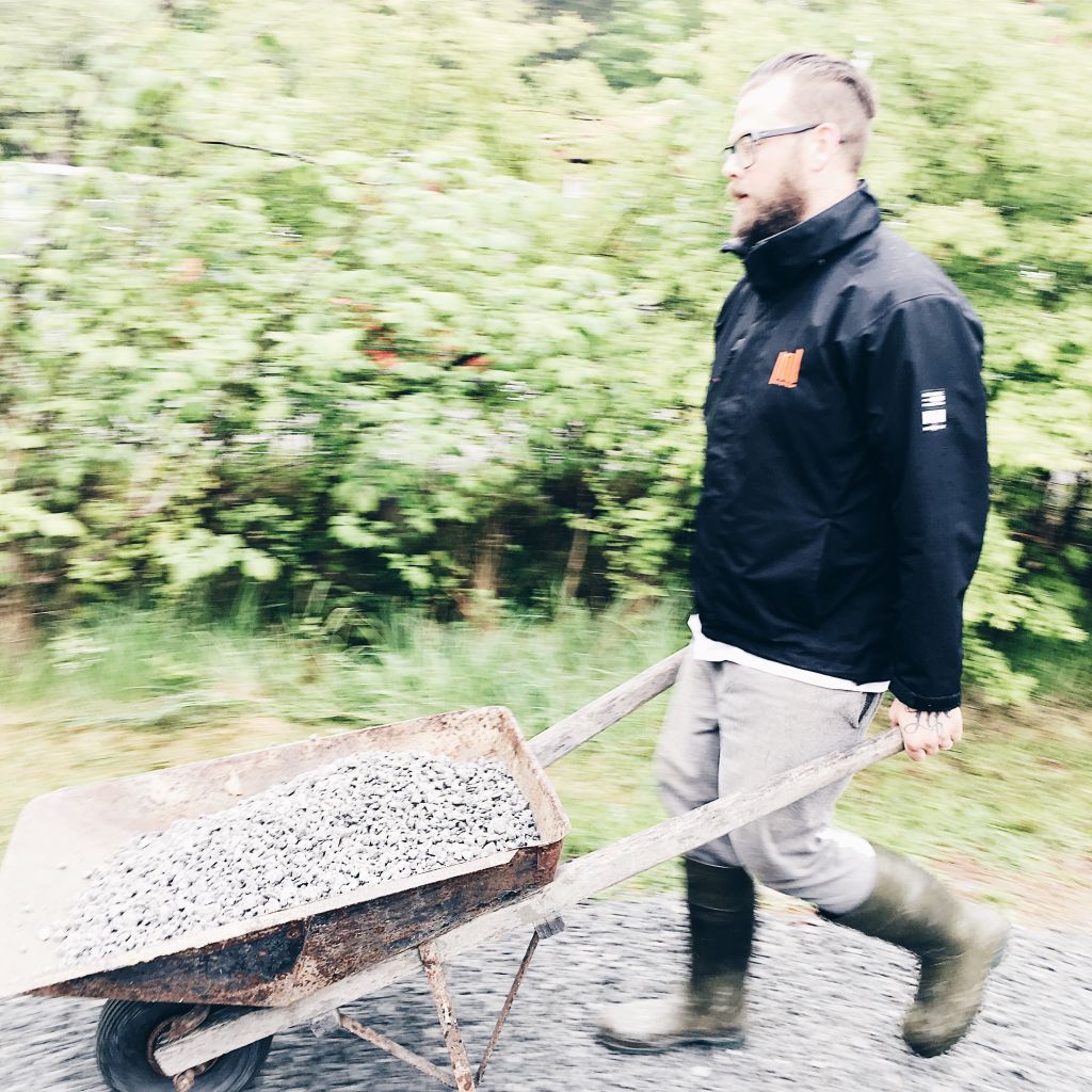 Nu ligger det grus på hela uppfarten. Tony slutför det sista där ute.