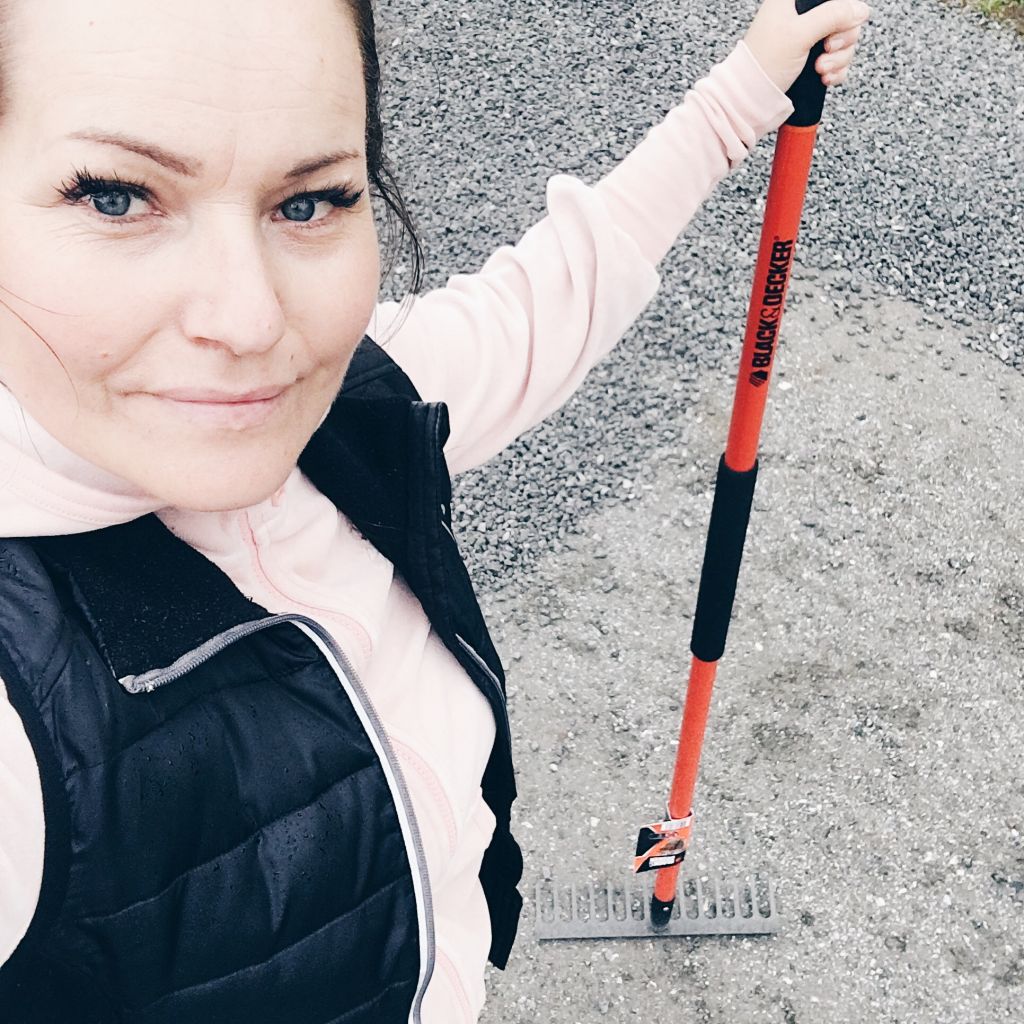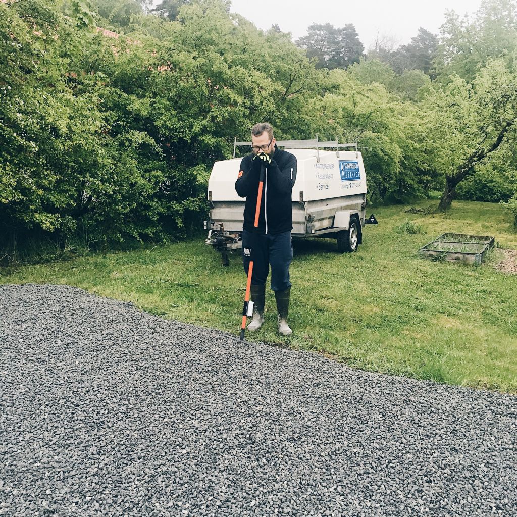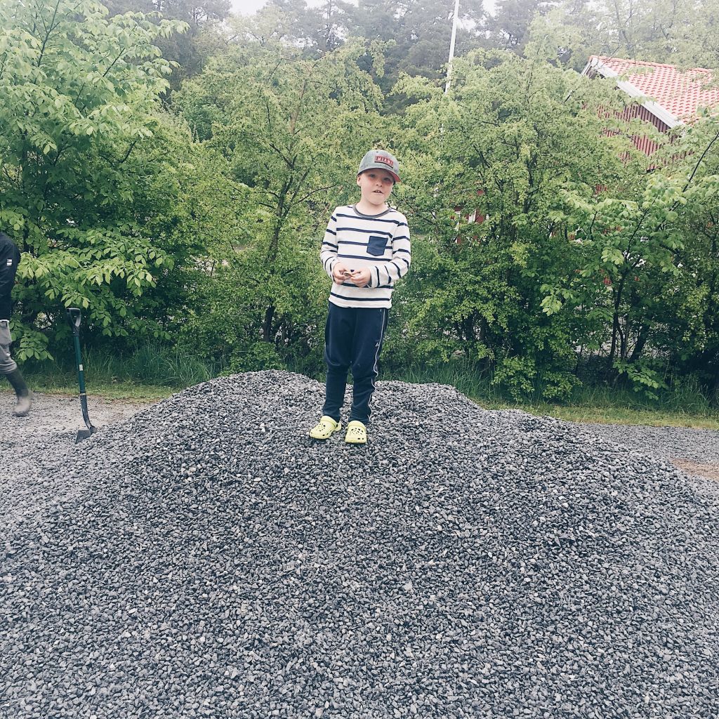 Åh fifasen vilket jäkla jobb det var alltså. Vi slet som djur. Ångrade en stund att vi beställt gruset eller varför vi inte lejt bort själva fixandet. Men då hade det säkert kostat dubbelt upp. Tony köpte tack och lov en ny kratta, den andra vi har har gått av i skaftet. Det hade varit lite tuffare…. Haha! Kratta med en bebiskratta liksom.