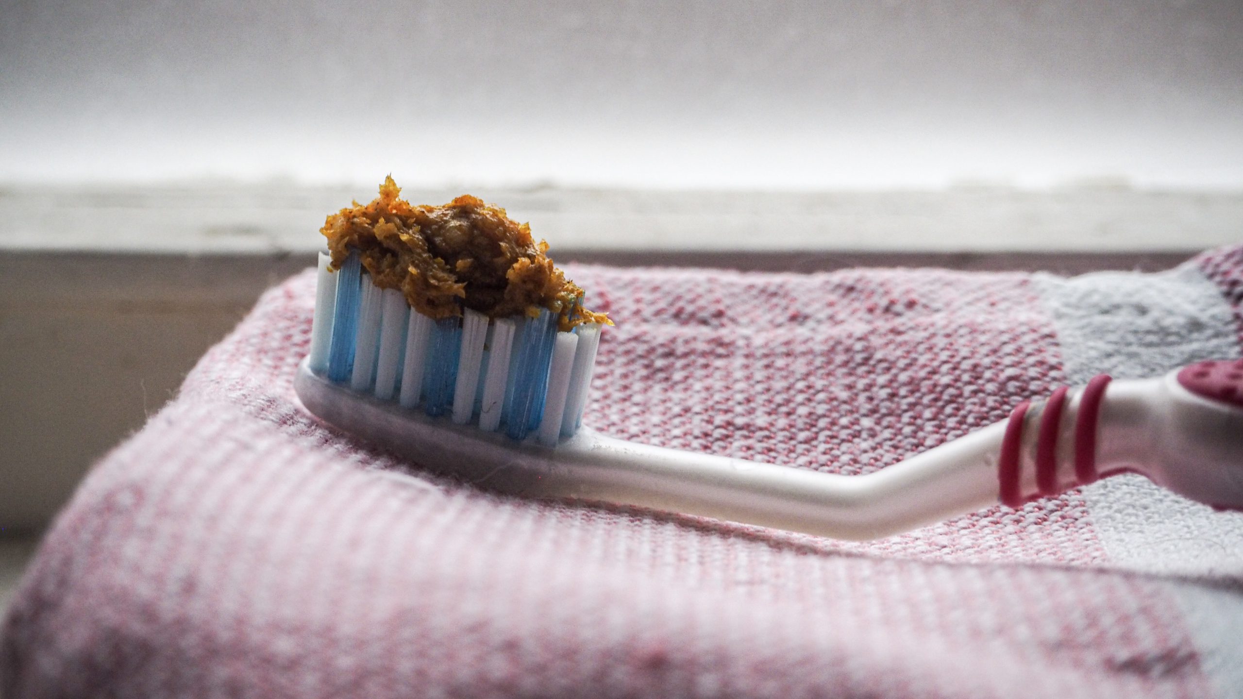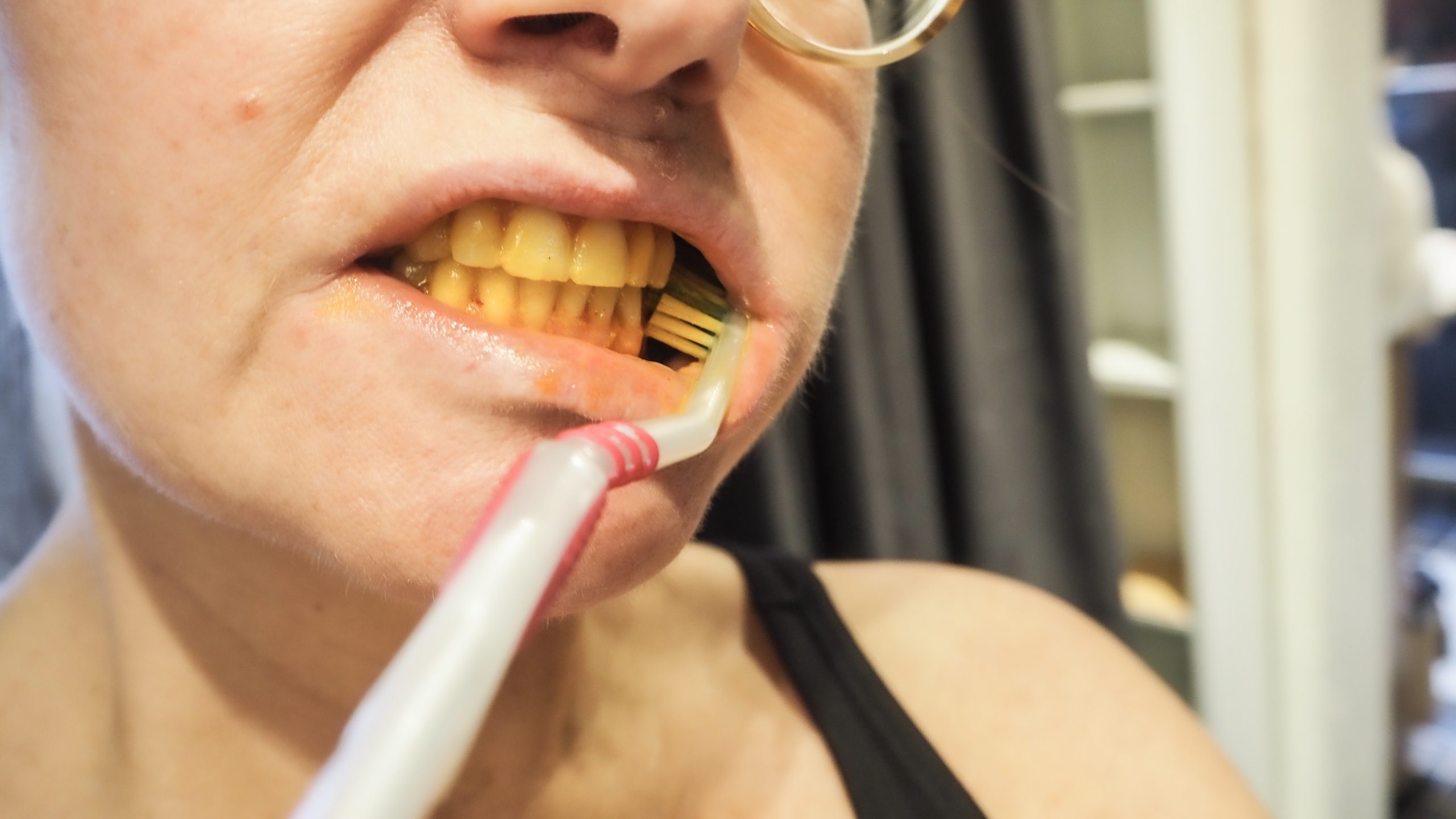 Medans man borstar så blir tänderna helt gula. No worries, det går bort med vatten eller när du borstar tänderna vanligt efteråt.