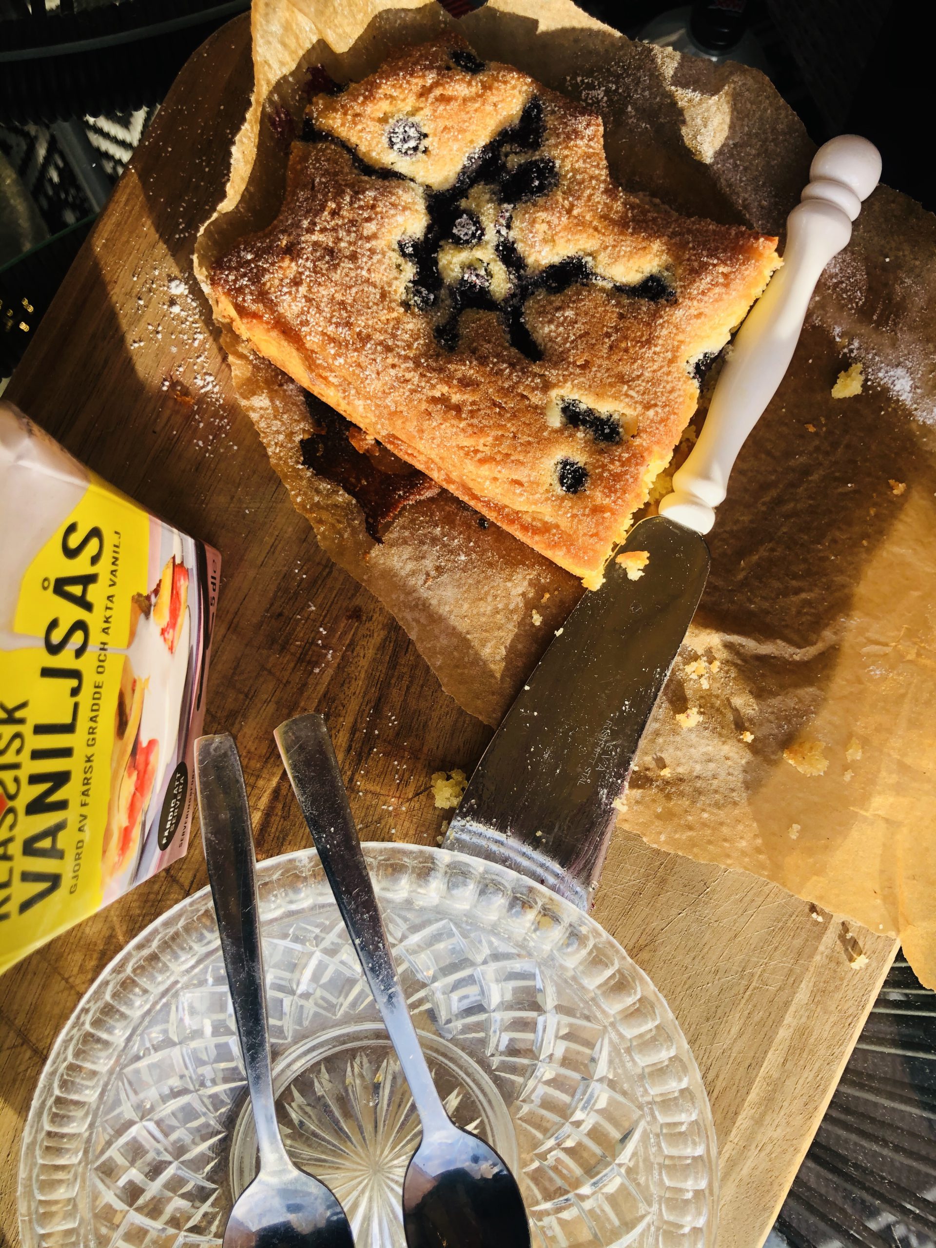 3) Lägg bakplåtspapper i botten på en brödform och häll i smeten. Droppa på lite blåbär och in i ugnen på 225 grader i 5 minuter, sänk sedan värmen till 200 grader resterande 10. Känn med sticka så kakan är nästan genomgräddad. Pudra med florsocker och servera med vaniljsås.
