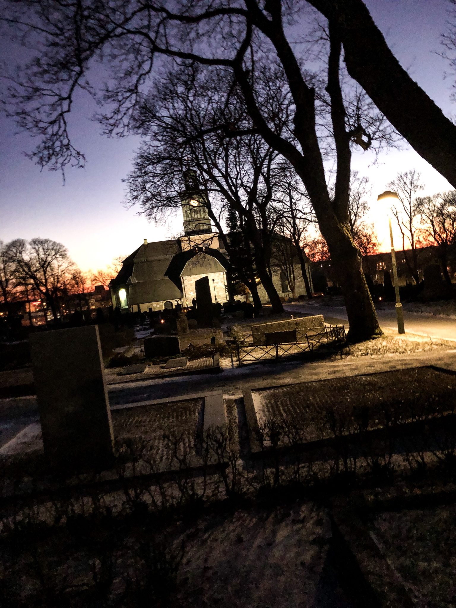 Efter det så gick vi till kyrkogården för att tända ljus hos Linda. Kyrkan stod så maffig där.