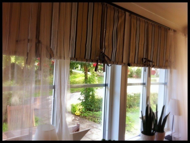Såhär blev det färdiga resultatet. Hissgardiner i köket. Busenkelt att sy själv, har tagit ett par timmar att sy. Sen ska jag snickra ihop en köksbänk som jag ska ha på ena sidan av köksbordet. På andra sidan ska jag ha 3 vita stolar. Blir fint när det blir klart.