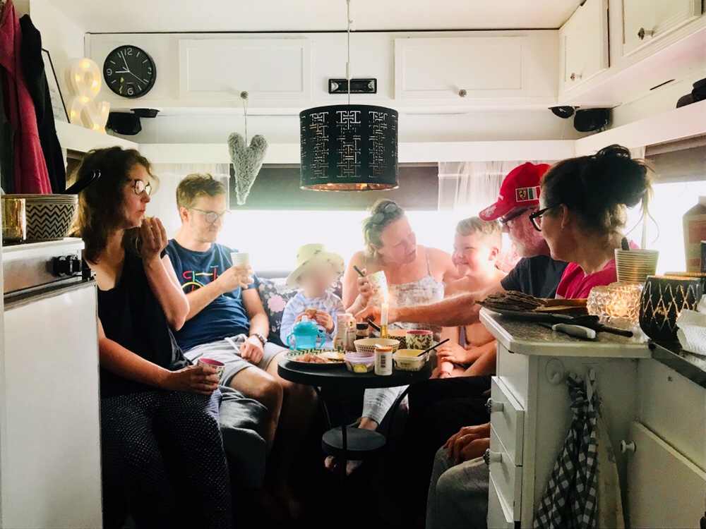 I morse hade vi världens mysigaste frukost i vår husvagn. Hela stora konkarongen fick plats. Mycket gapflabb och trams. Så typiskt när min familj samlas. Galna finnar hela högen. Å så våra män, syrrans och min, som endast kan några finska ord. Svenska och finska blandas nämligen högt och lågt när vi är i farten även om vi verkligen försöker bara prata svenska när dom är med.