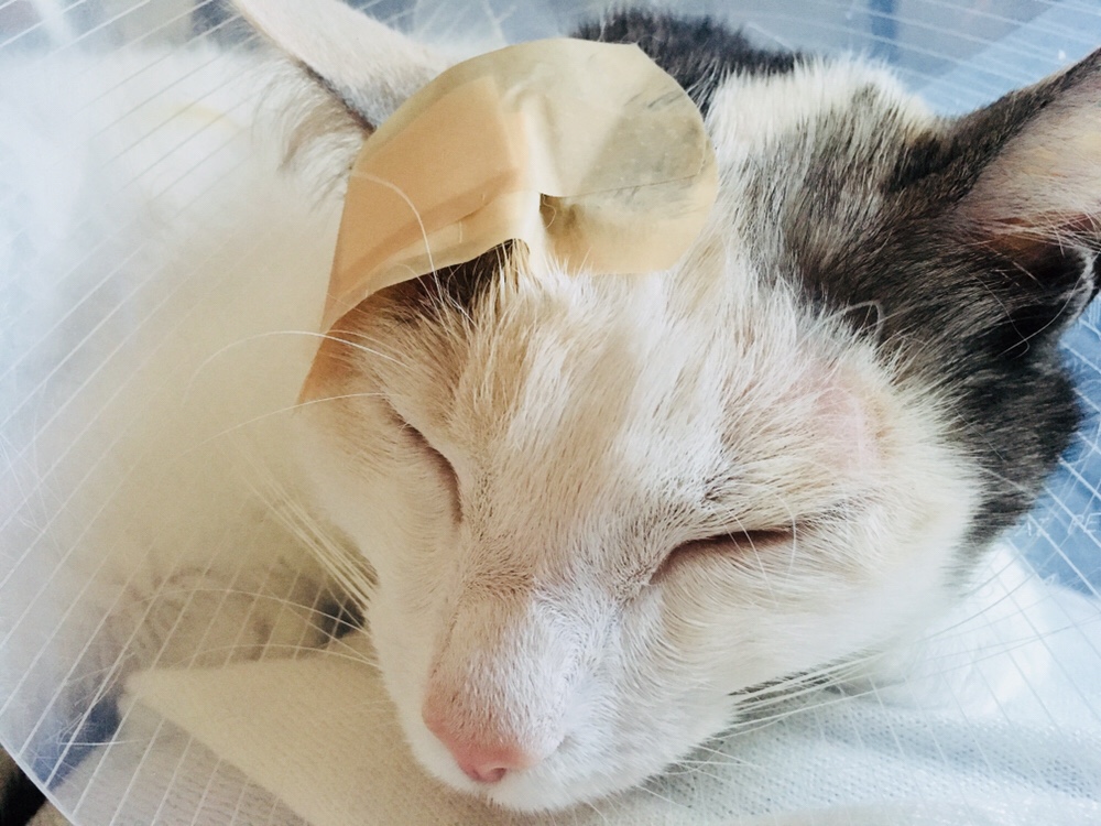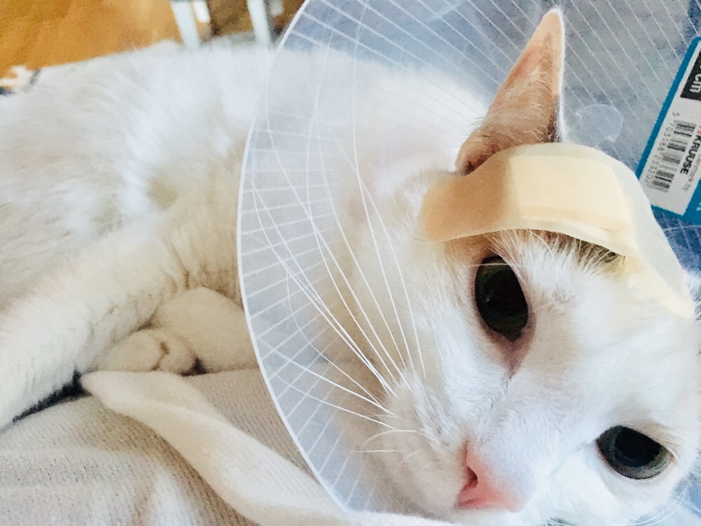 Vi sätter ett plåster på det sista såret som är kvar nu (3 av 4 sår är läkta). När jag rengjort det (gör det 2 ggr per dag) så har jag på en sårgel som hjälper läkning. Den lille skitungen har nämligen kommit på att man kan pressa tratten hårt mot såret och sen slicka på tratten. Sen fortsätter hon så. Men plåstret på går det inte…