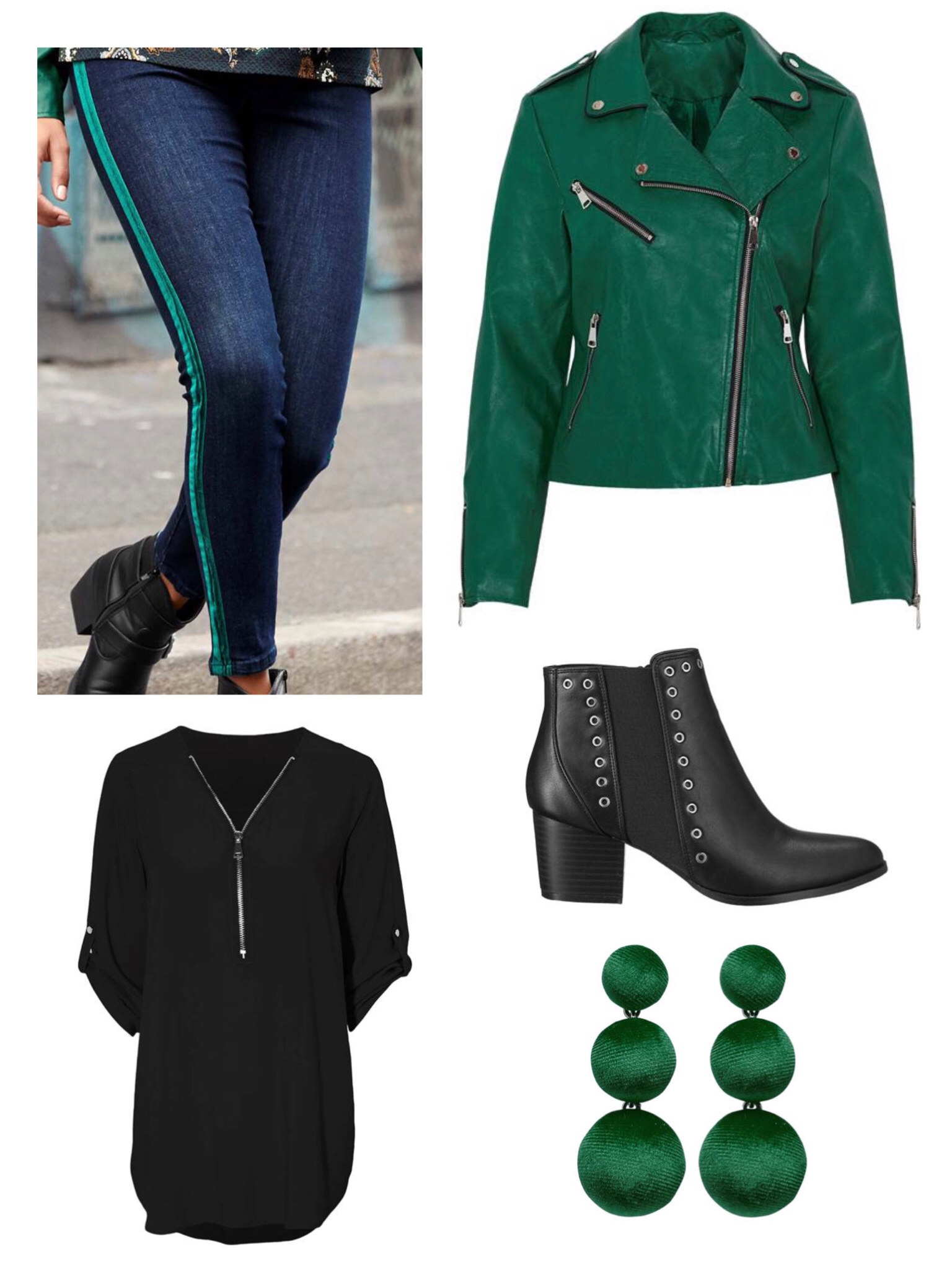 Gillar man färg är ju detta så coolt. Älskar den gröna färgen, snacka om härlig färg. Den svarta blusen har jag själv. Har använt den hur mycket som helst. Den fina dragkedjan i halsen är en jättefin detalj som gör hela blusen lite finare och festligare.