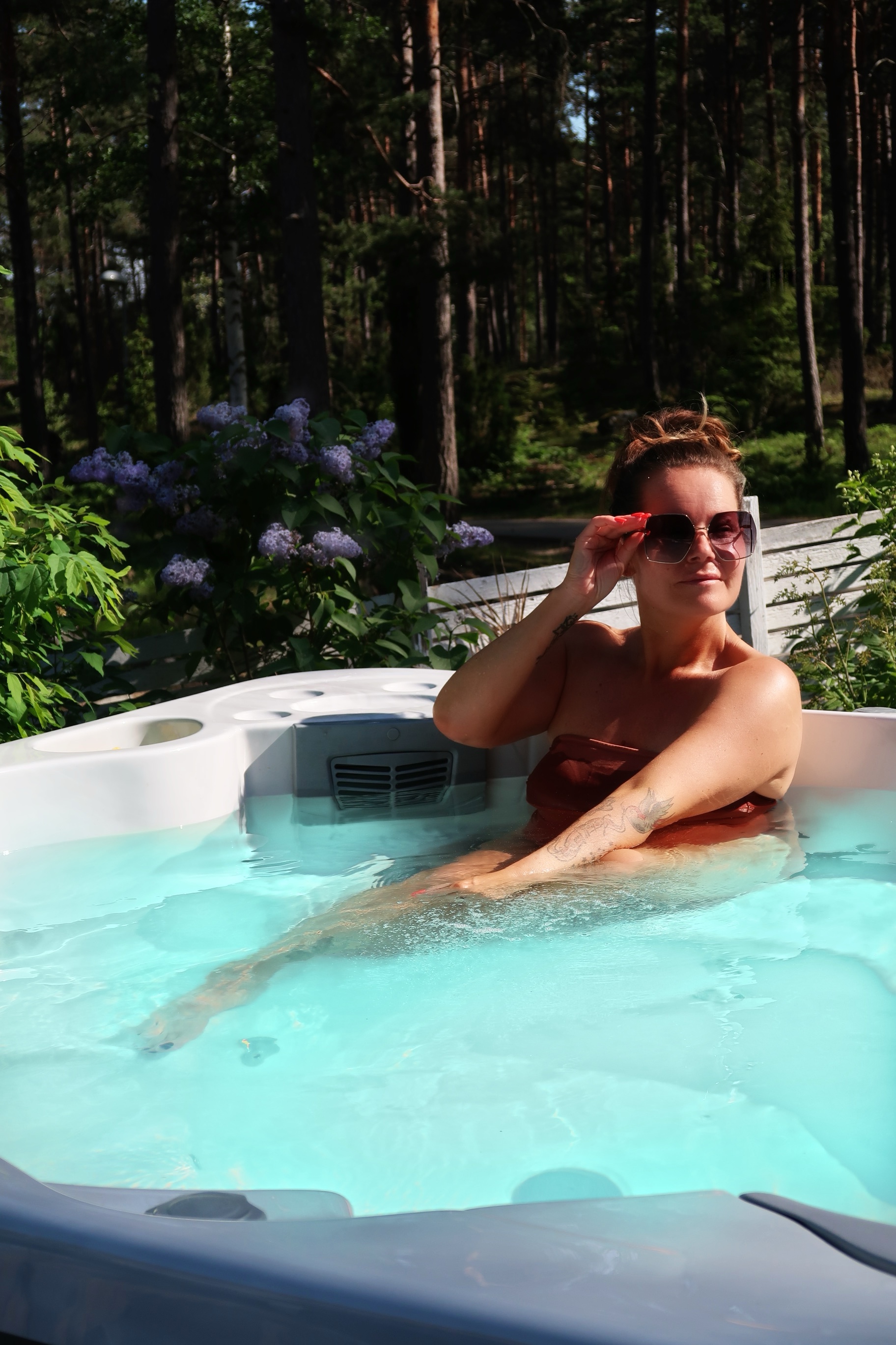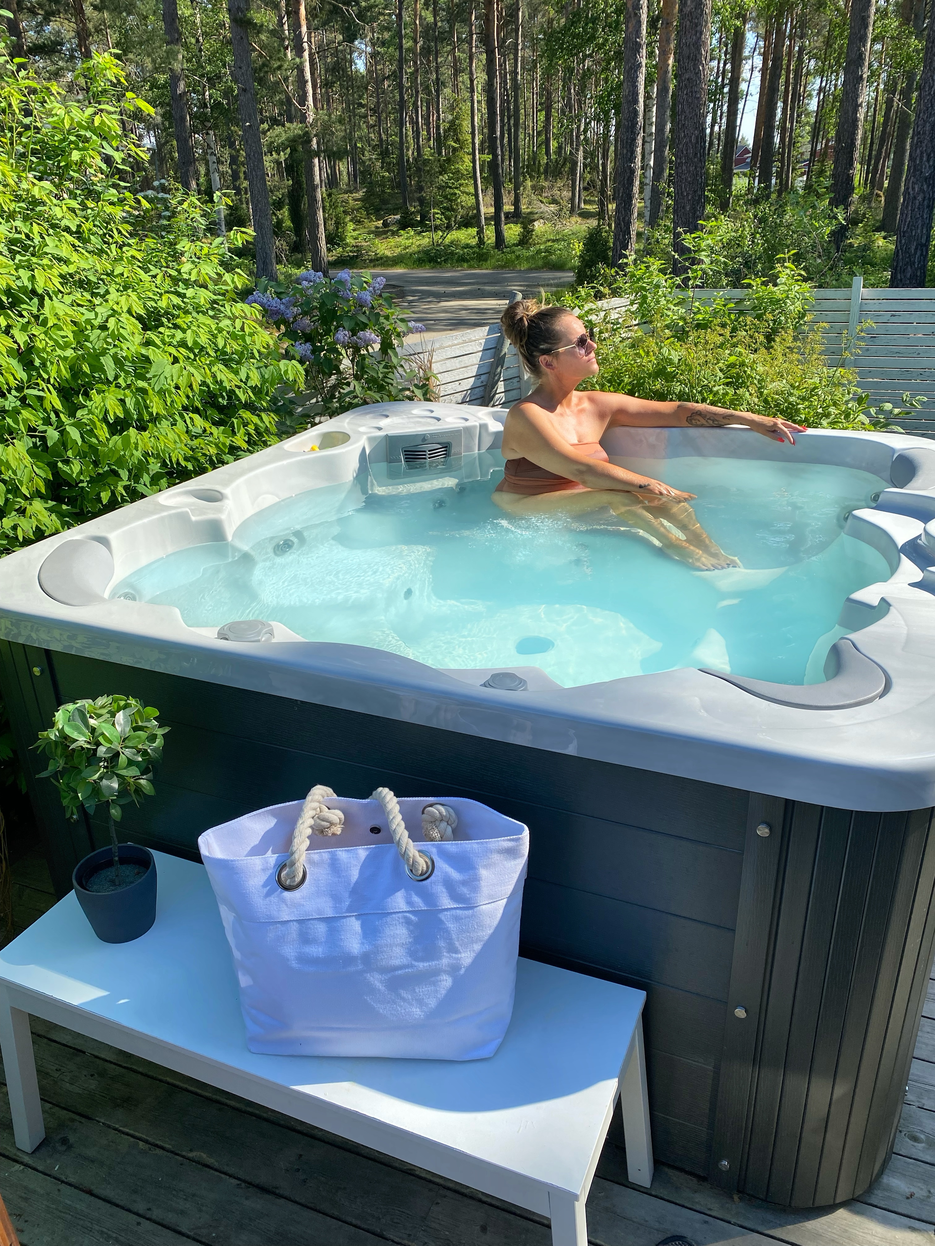Något jag också klurade på var om den skulle vara jobbig att sköta? I vår familj är det bara jag som sköter dessa spabad. Tony tror inte att han kan och dessutom tror han att jag är värsta proffset. Haha… det kan väl han få tro. Det enda man ska hålla ordning på egentligen är att det alltid finns klor i. Och att kolla med provstickorna att det är bra värden i den. Sköter man det har du ett underbart rent och härligt spabad hemma.