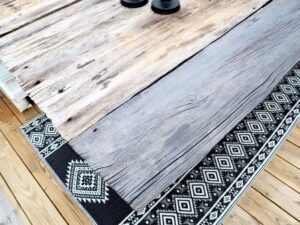 Började stryka vårt utrbord med trälasyr i färgen järnvitriol. Här är en planka struken. Visst blir det bra? Ska göra färdigt imorgon då det ska vara fint hela dagen.