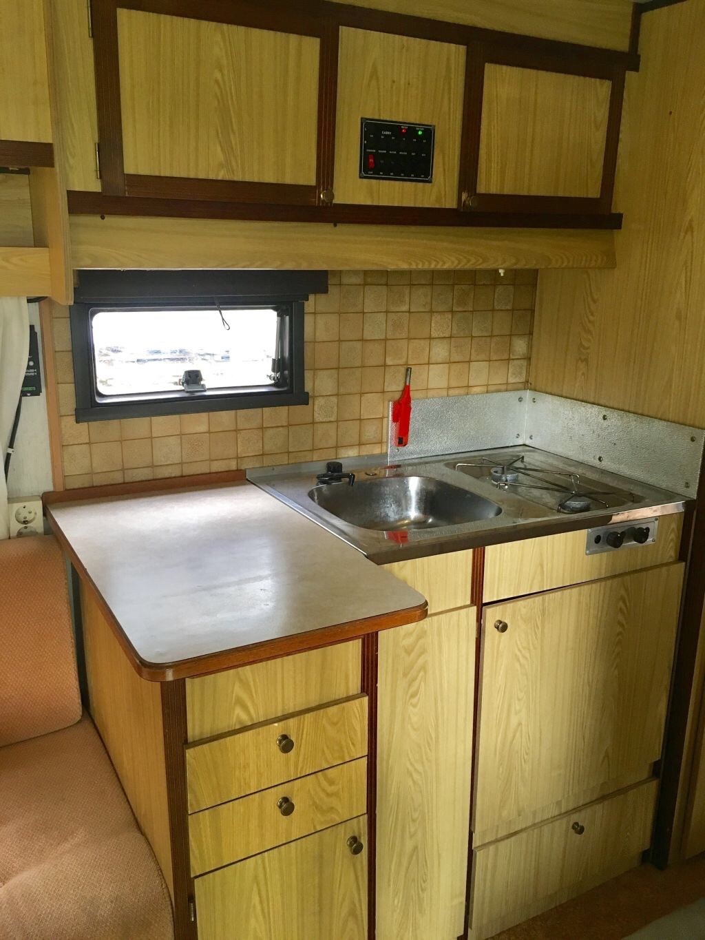 Köksdelen där vi ofta sitter och myser eller äter frukost såg ut såhär. Typisk 80-talshusvagn. Lampan var riktigt snygg va?