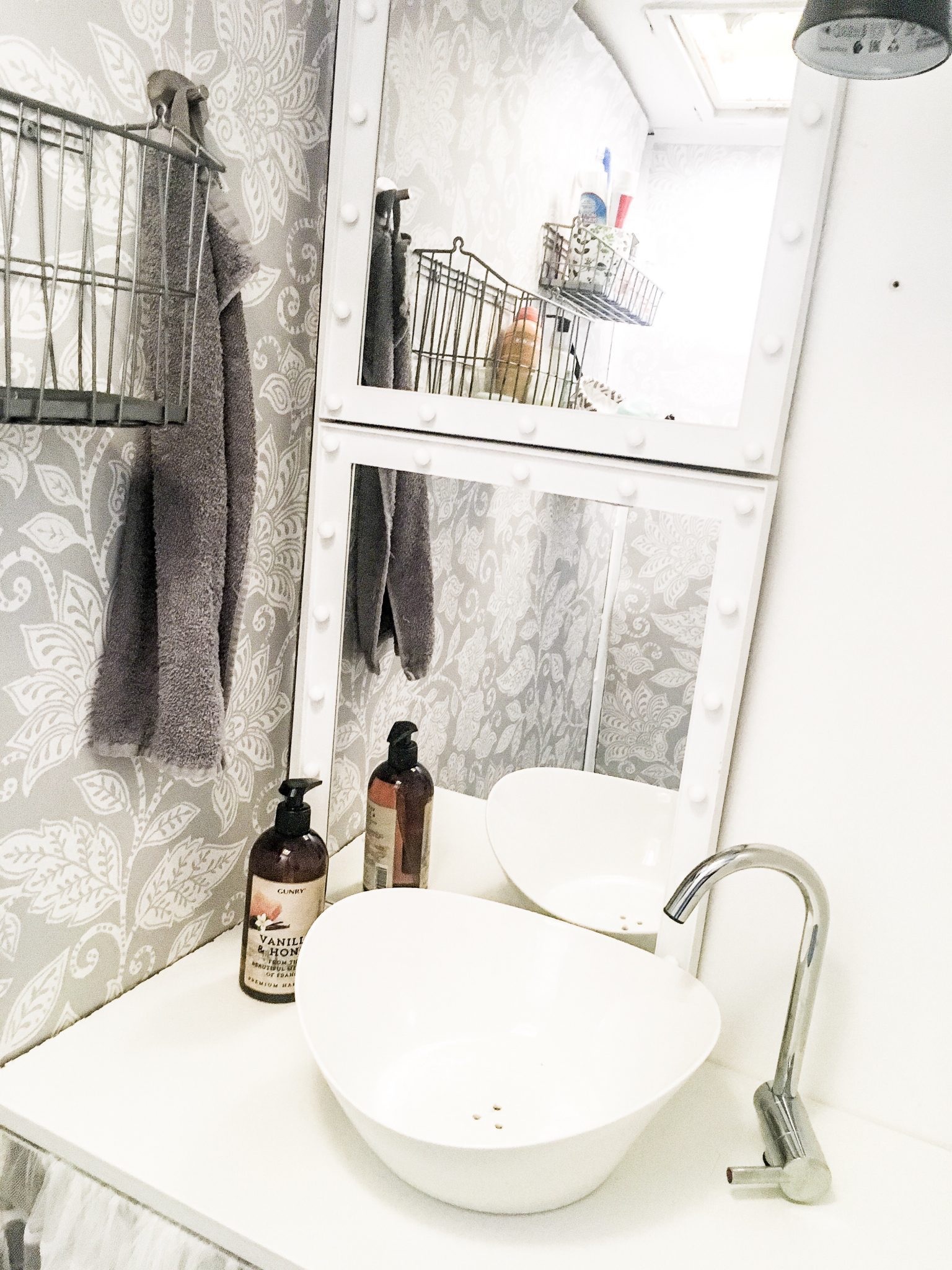 Här satte vi in ett hyllplan och bytte handfat till en salladsskål och ny kran.
