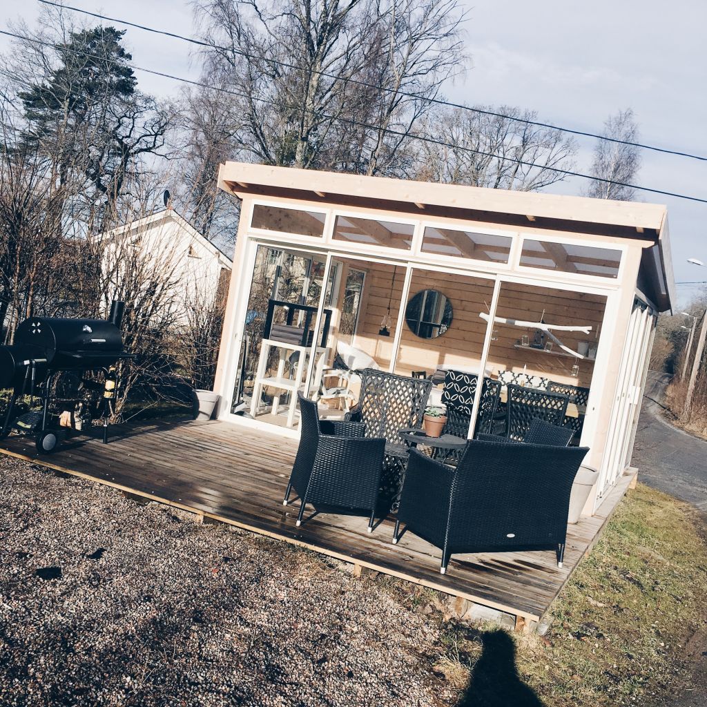 Uterummet stod där i solen så fint när jah kom hem. Du ser tre små bord uppepå varandra inne i uterummet, ja dom ska inte stå där inne. De ska stå utanför kaffestugan. Har söta små planer för dessa bord jag….