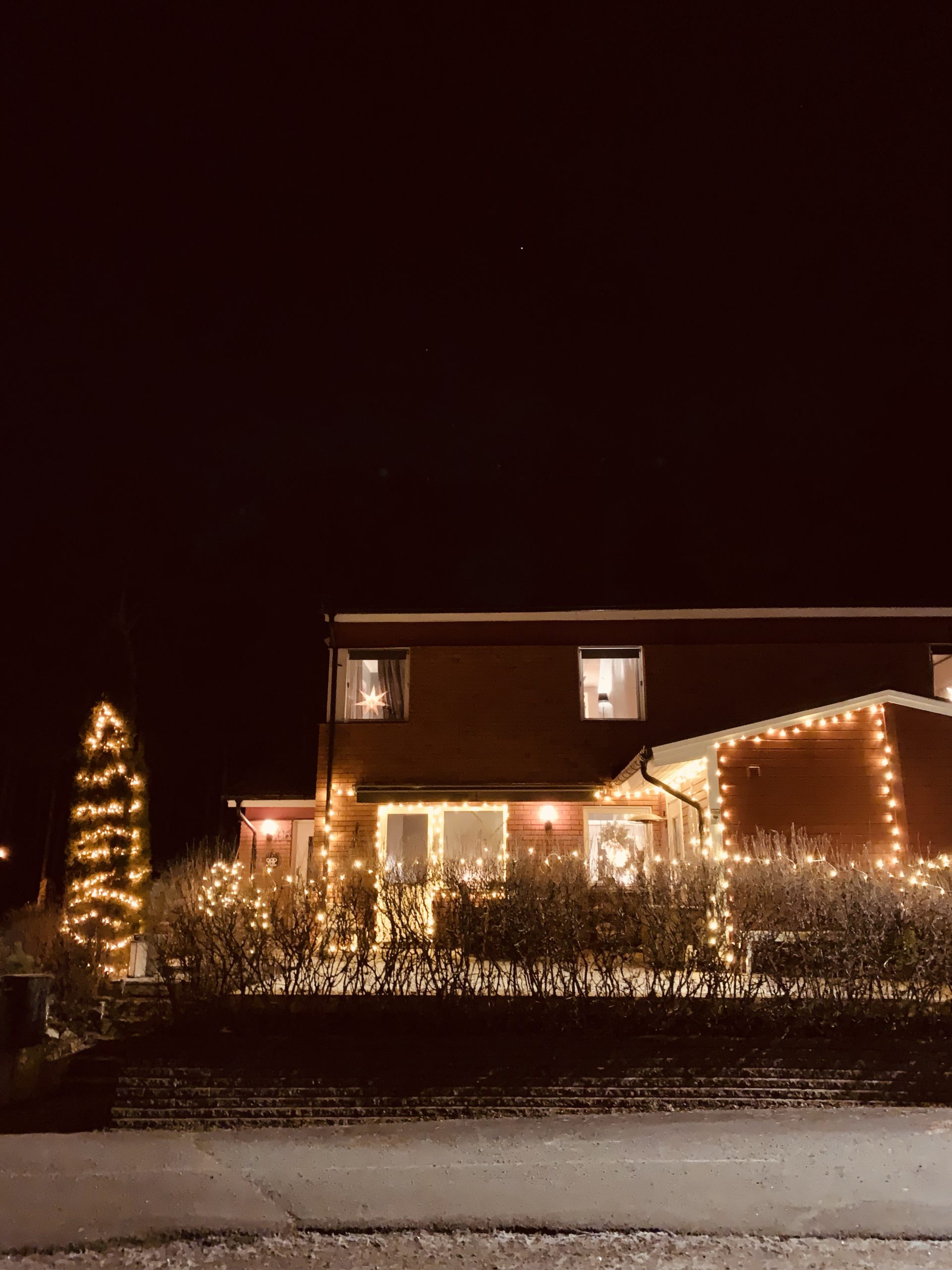 Vi har julpyntat järnet nu. Utomhus så ser det ut som man kommer till en sån där amerikansk gata där man gått bananas med julpyntningen. Så går det när man skickar ut karln med över 50 meter ljusslinga. Haha….