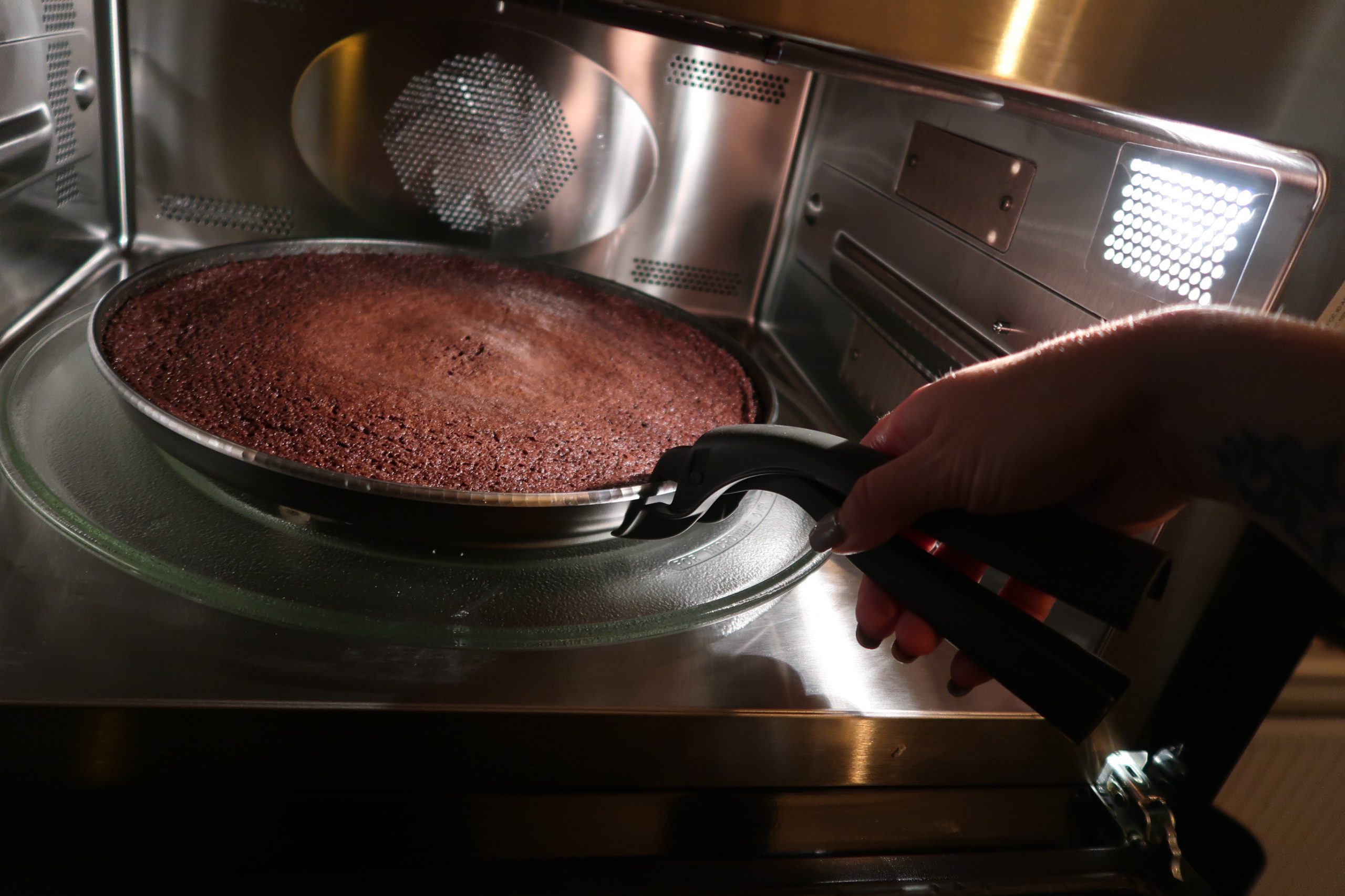Öppnade mikrovågsugnen och tammetusan! Där hade vi en perfekt kladdkaka. Tog tången (som följer med) och löft ut kakan och var sådär galet ivrig att få titta in i den. Hur blev den, rinner den bara eller är det verkligen en kaka?