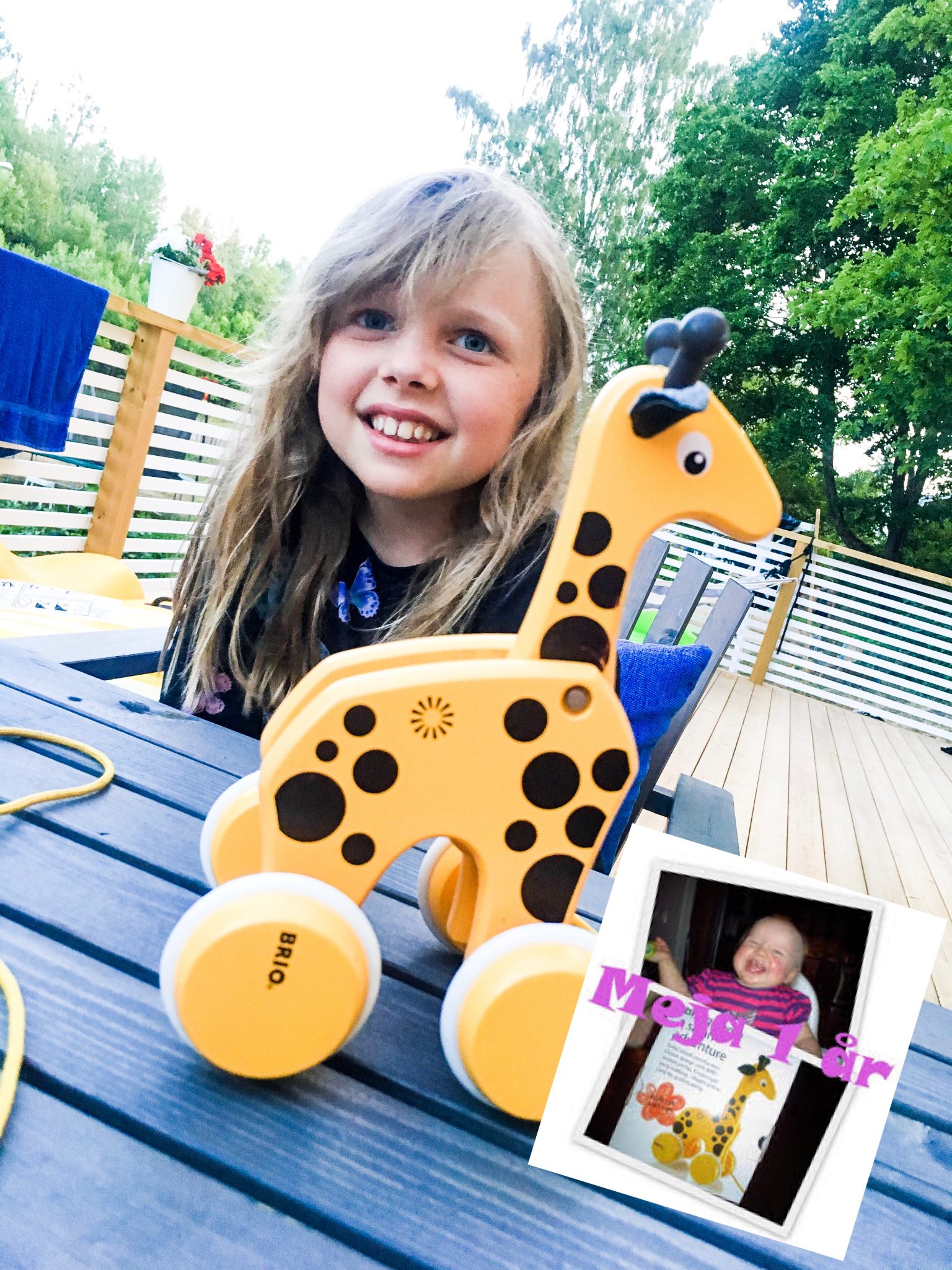 Igår tittade vi på gamla foton och så skrattade vi gott åt att Meja blev påmind om att det var vi som köpt den här Brio giraffen till henne när hon fyllde 1 år. Kolla den lilla bilden.