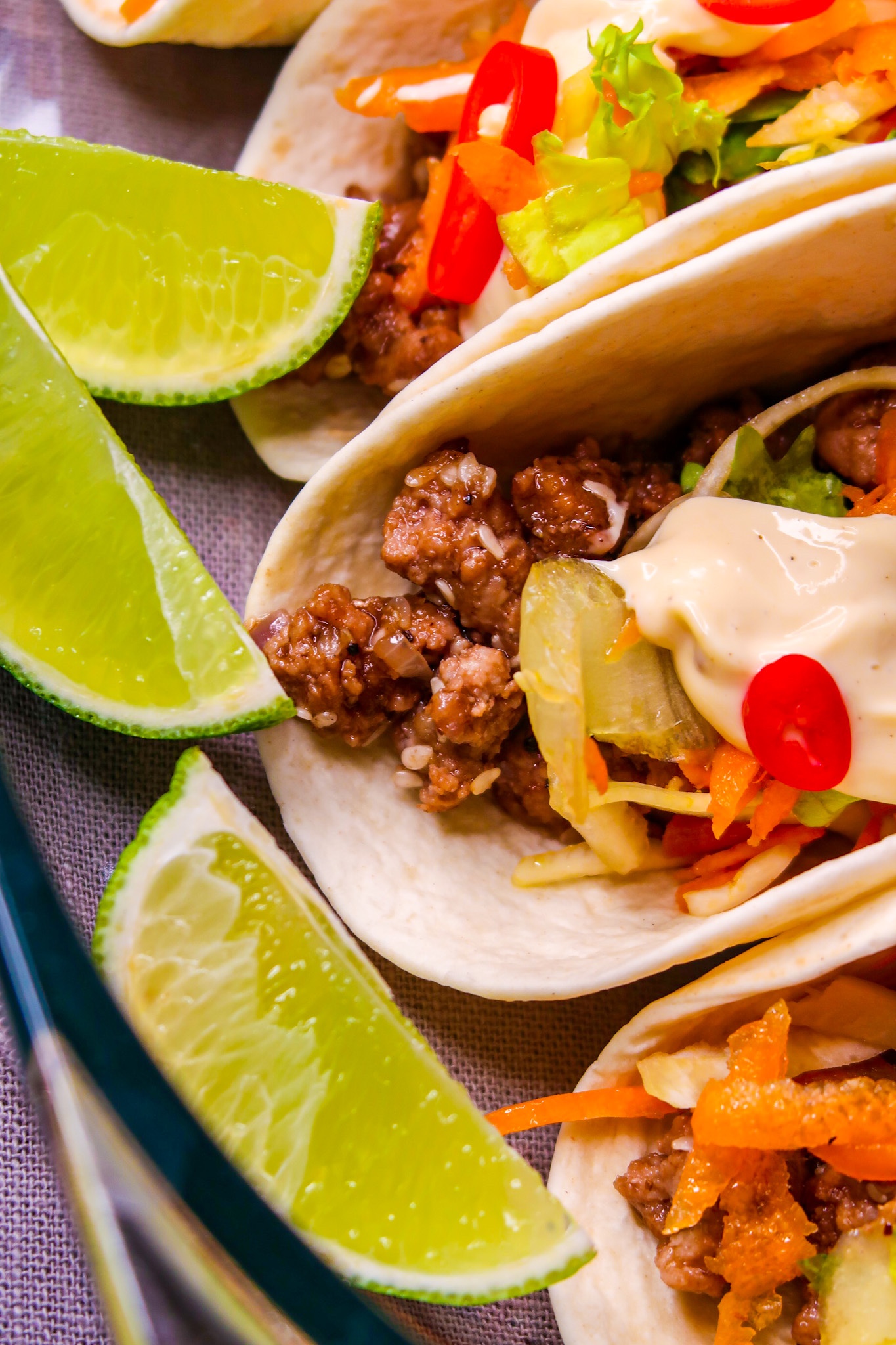 6) Preppa färdiga tacos med blandfärs bladningen, strimlad salladsmix och asiatisk majonnäs över. Avsluta med några chilisar på.