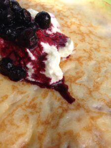 Glutenfria pannkisar med frysta (tinade) blåbär rullade i socker, vaniljsocker och så laktosfri grädde till. Mmmm – mmmmmm – mmmmmmmm! Alltså, sååå gott. Tack och lov så behärskade jag mig lite och åt 2 stycken, hade lätt kunnat äta ”tjufler”! Ibland blir det såhär, då brukar jag bara kööööööra. Smaska i mig och njuta för fulla muggar. Sen kör jag lite bättre mat till kvällen istället. Ingen fara på taket.