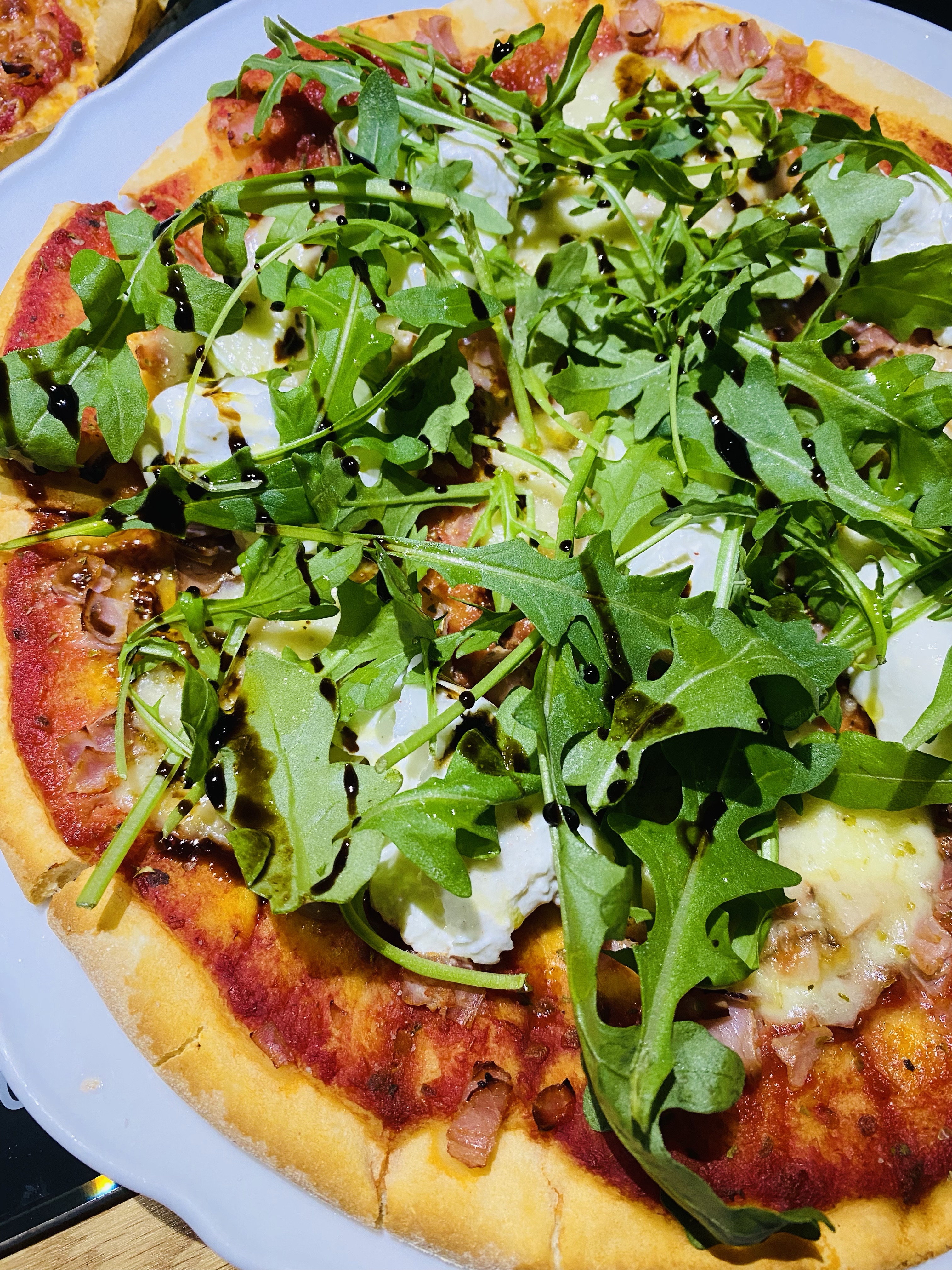 Kvällen tillbringade vi vara hemma. Nästan hela familjen samlad på Fredagsmiddag. (Ja inte Thedde då som bor i Schweiz, alltid så saknad här hemma). Vi åt rökta räkor och lime-aioli till förrätt, sen blev det hemgjord pizza till varmrätt. Jag gjorde en med tomatsås, rökt skinka, mozzarellla som gräddades först i ugnen. Sen på med massa ruccola, nästan en hel burrata, olivolja, salt och balsamico. Såååå sååå god! Om du önskar bra glutenfri botten till pizzan kan jag verkligen rekommendera denna. Den blev såå god!