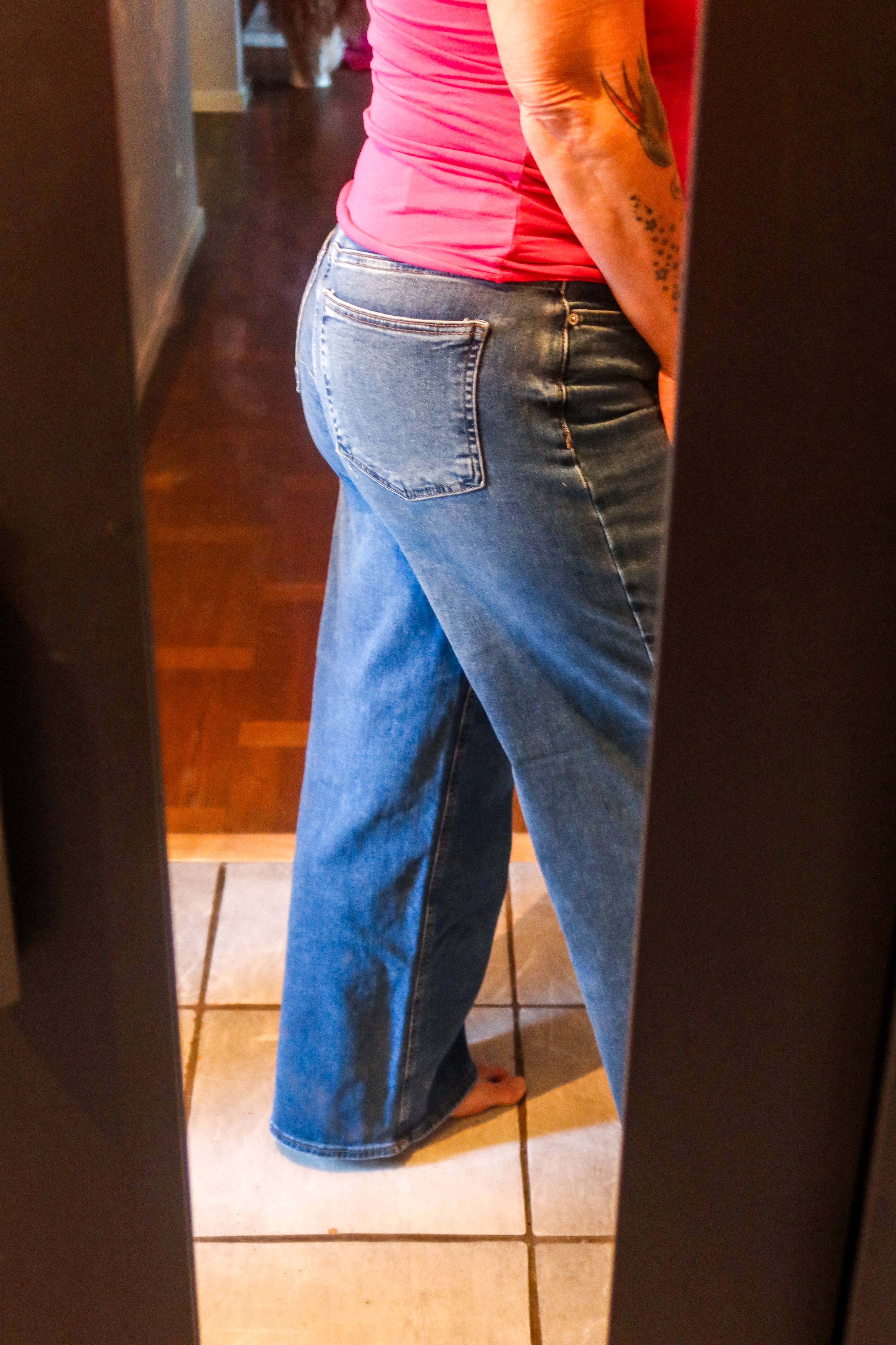 Vääääärldens skönaste vida stretchjeans har vi HÄR. Åh dom är alldeles ljuvliga på, som mysbyxa. Dom är lite små i storleken så gå upp om du köper. Dessa kommer jag kunna använda i sommar också med klackar eller sandaler och sneakers. Älskar!