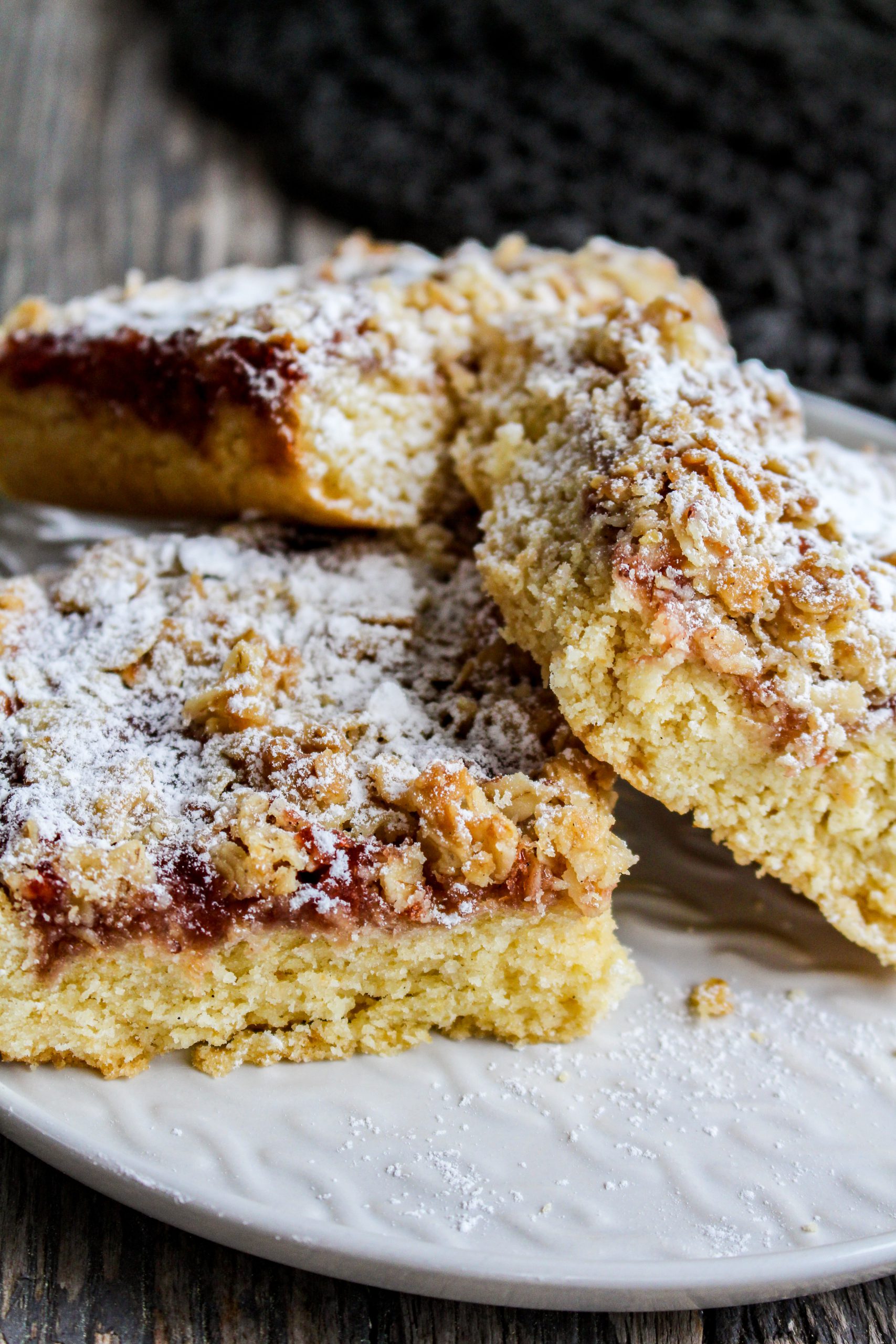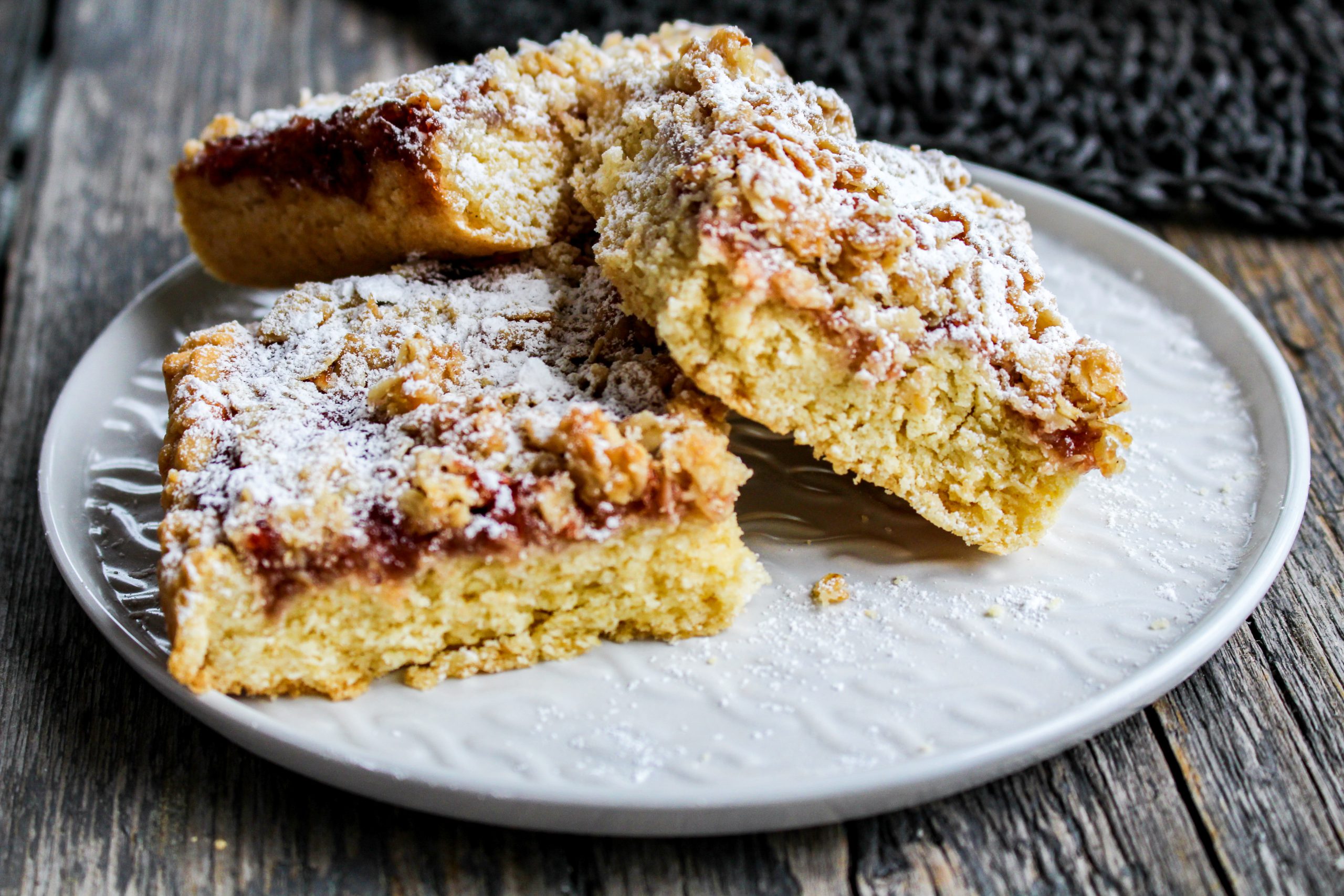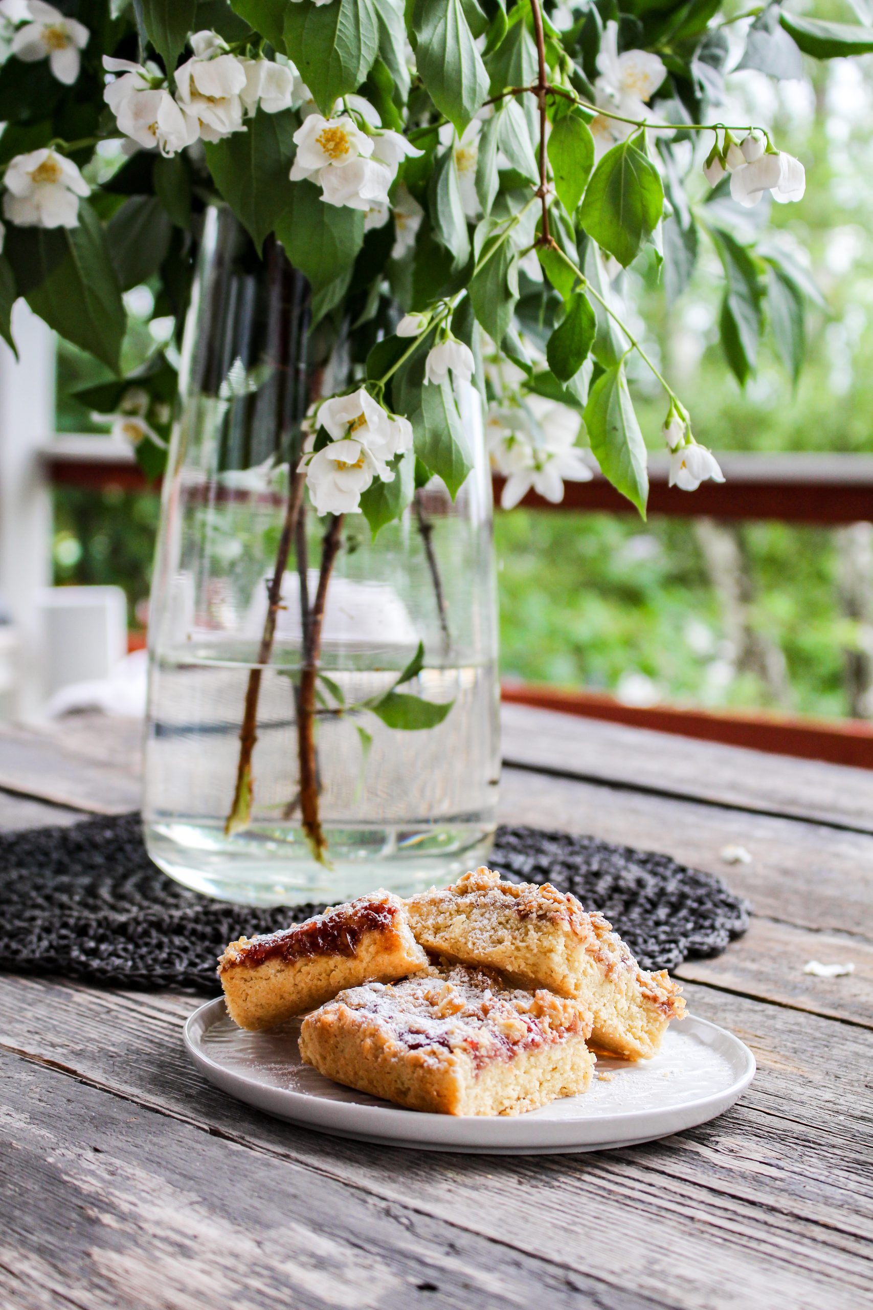 Ok, de här rutorna bara måste du testa. Detta är ett enkelt recept att svänga ihop och det blev verkligen såååå såååå gott. Grunden är lite som en mördeg men lite mjukare. Sen är jordgubbssylten som en skänk från ovan på kakan och smulet uppepå får tungan att krulla sig av välbehag. En riktig sommarkaka är det. Inspirationen kommer från kollegan Frida på Fridas Bakblogg.