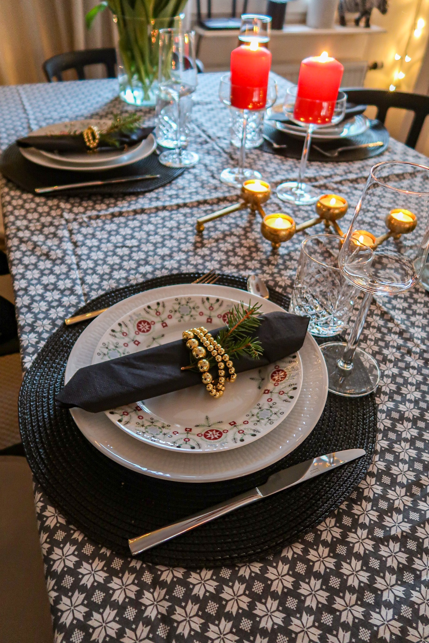 Fick använda min nya vinterservis för första gången. Åh vad jag älskar den! De vita underst är 27 cm och heter SNÖ i färgen, finns HÄR (Rea nu). Mindre tallrik i WINTER serien HÄR. Jag har också 3 mindre skålar för att använda till olika röror och såser, finns HÄR (också REA). En stor skål för potatis/strips/sallad HÄR. Nya besticken (HÄR) var toppen att äta med också, så mycket bestick för så lite pengar. ÄLSK! Vinglasen (som jag älskar) är från Iittalas serie Essence, finns HÄR. Dricksglasen är stora favoriter, köpta på Mio, finns HÄR. De glas som får vara ljushållare på bordet är dessert/drinkglas från Iittalas Essence serie också, älskar dom! Används både som dessert och drinkglas här hemma. Finns HÄR.
