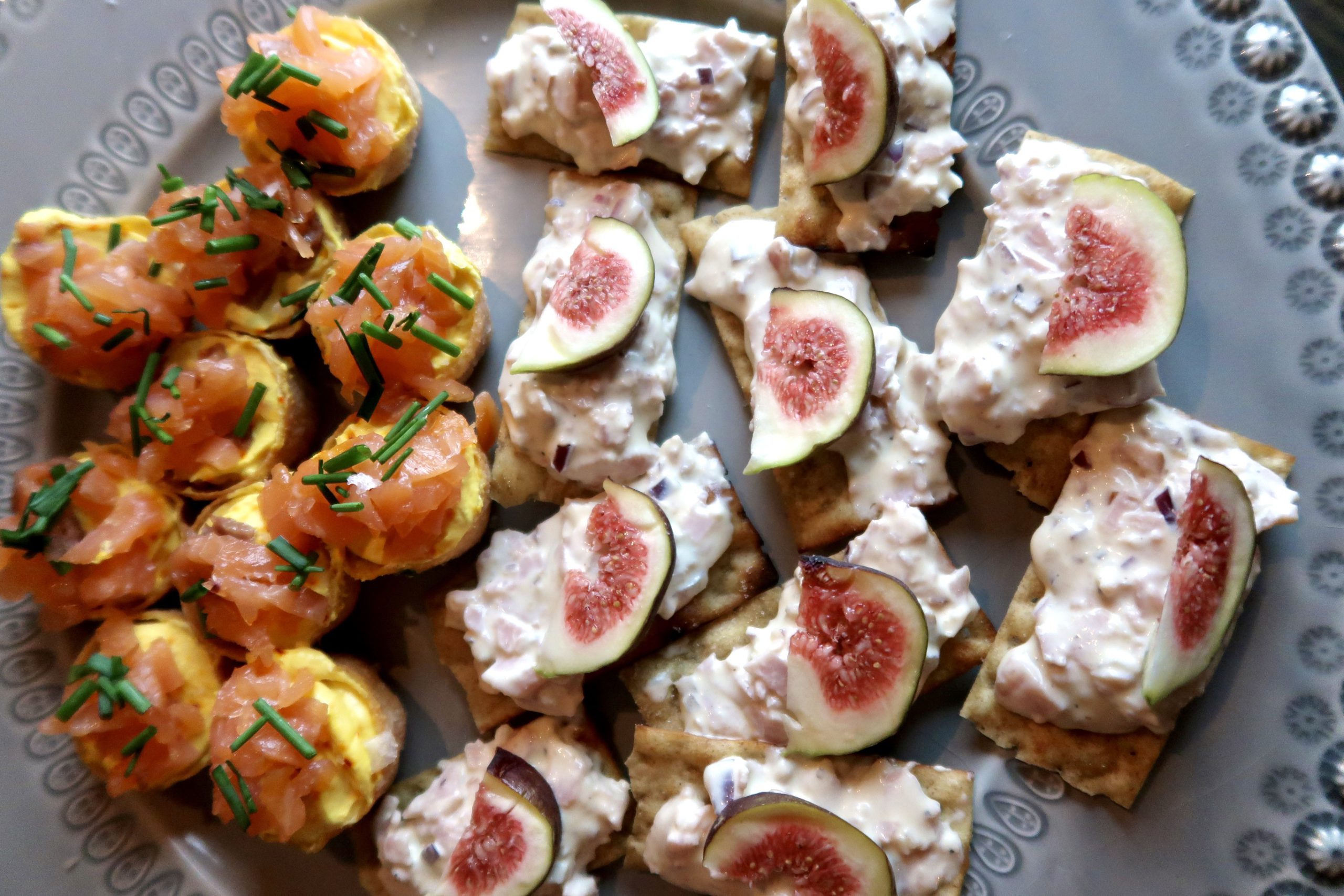 4) Dela knäcket på mitten och ha på röran uppepå. Toppa med en liten klyfta fikon.