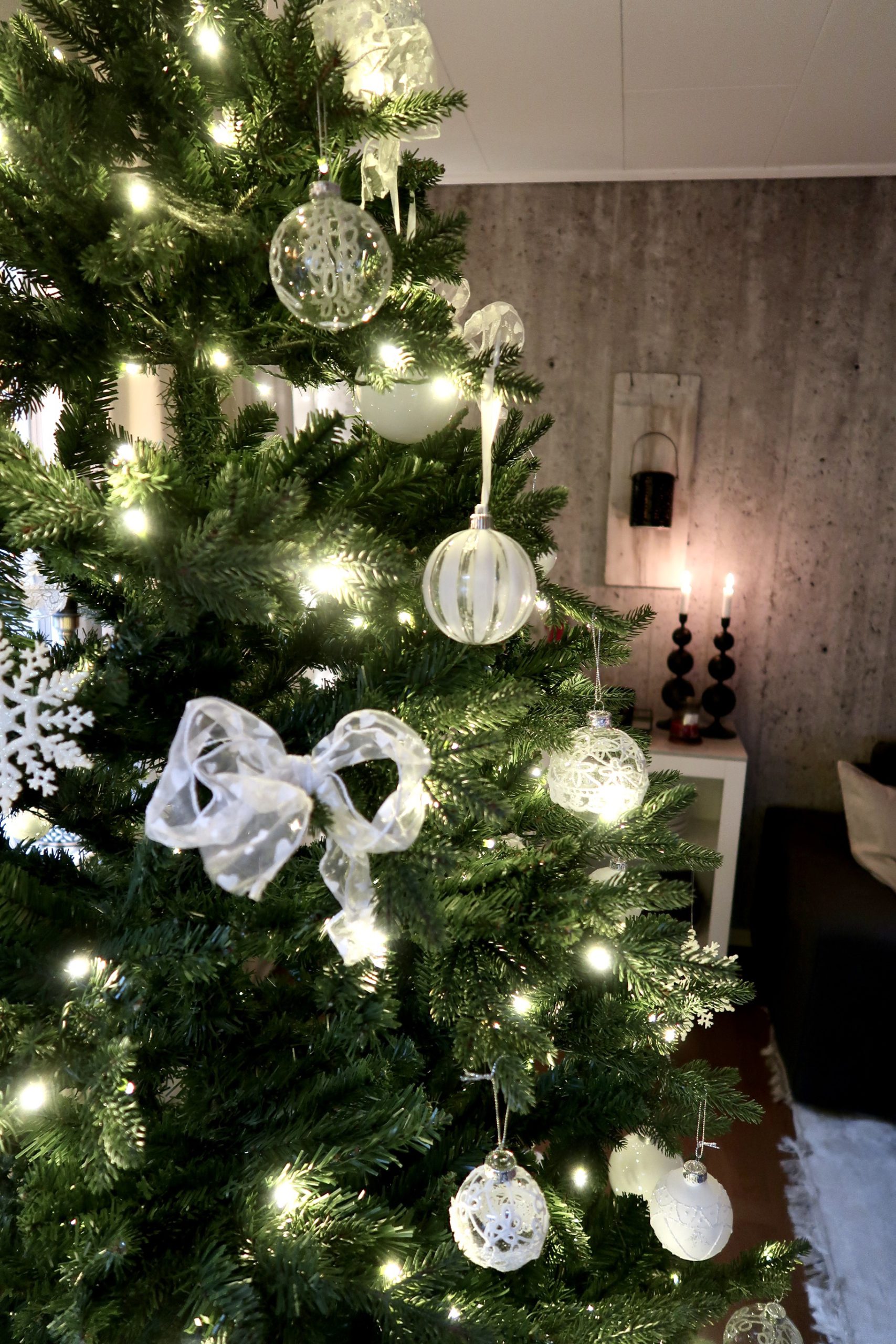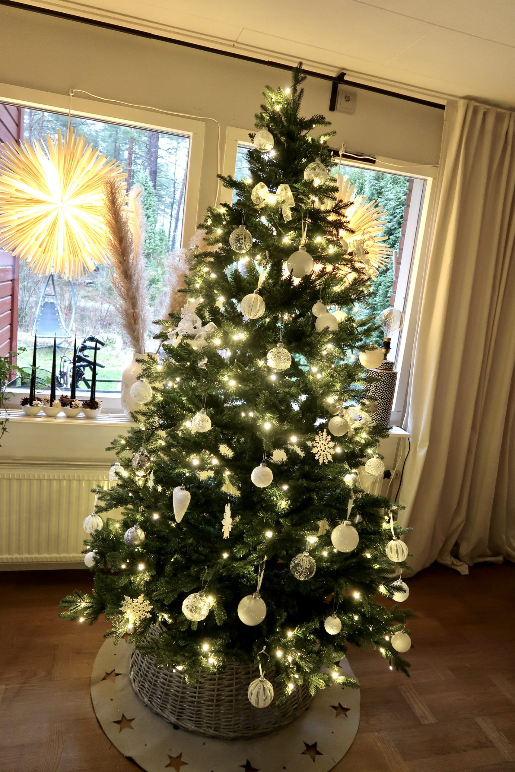 Den här är från Rusta och har belysningen i sig så att säga, älskar det! Älskar att de är lite små sådär. Den är 210 cm hög så den är rejäl också. Den förra var kanske lika hög som jag, kändes aldrig som en maffig gran. Denna känns som en riktigt maffig sak!