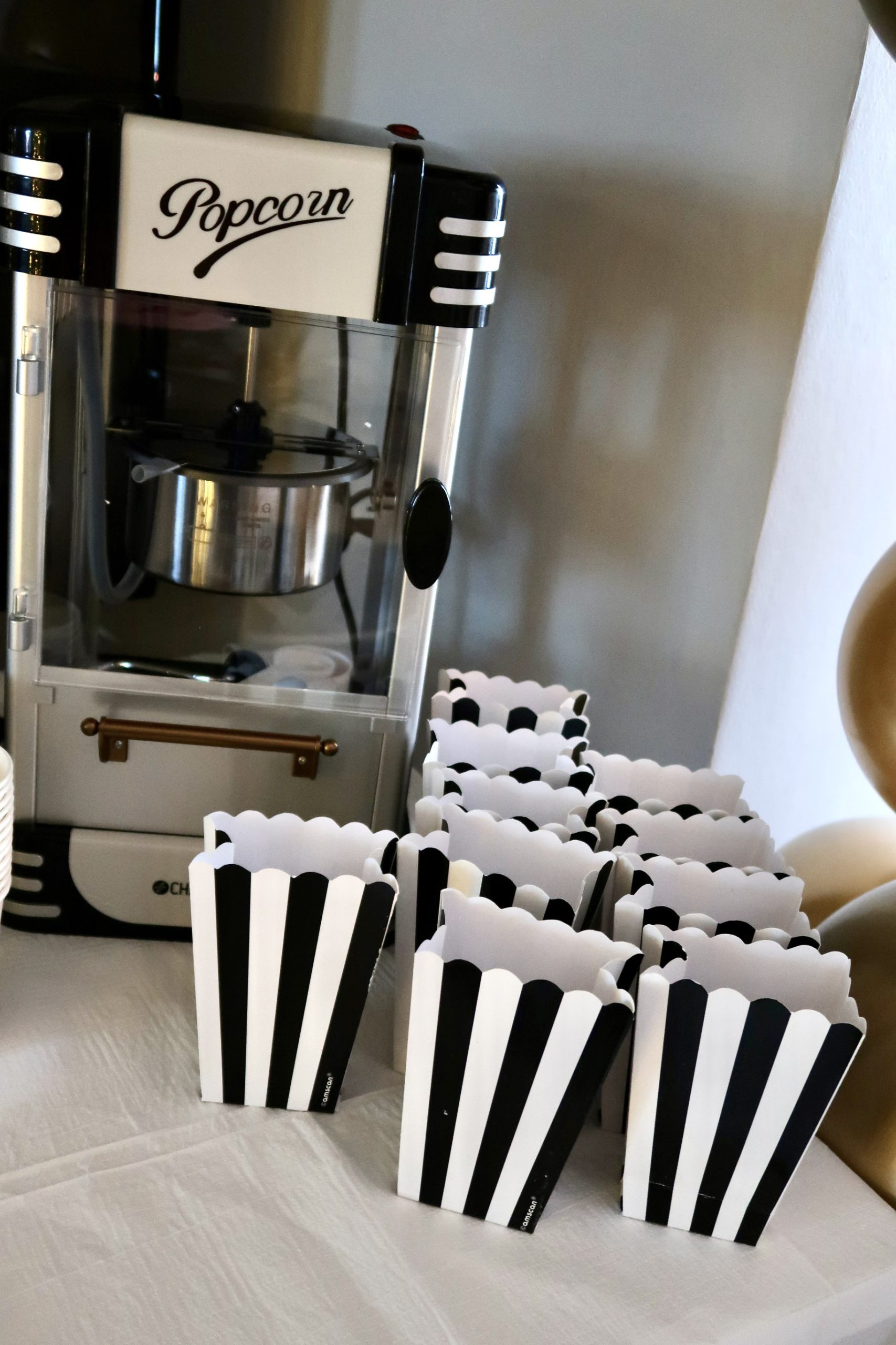 Som vi roddade för kalaset alltså. Det blev precis så som jag hade hoppats på. Här var förberedelserna igång för fullt. Köpt allt på Partykungen. Popcornbägare i olika sorter hittar du HÄR. Stripsbägare HÄR. Hamburgerboxar HÄR. Ballongbåge HÄR, finns sååååå många fina. Trodde dom skulle vara mycket dyrare, köper man en sån här klar är den ju svindyr. Men att köpa en sån här box, och såklart en ballongpump så hör du en själv. Tar lite tid men blev ju sååå bra!