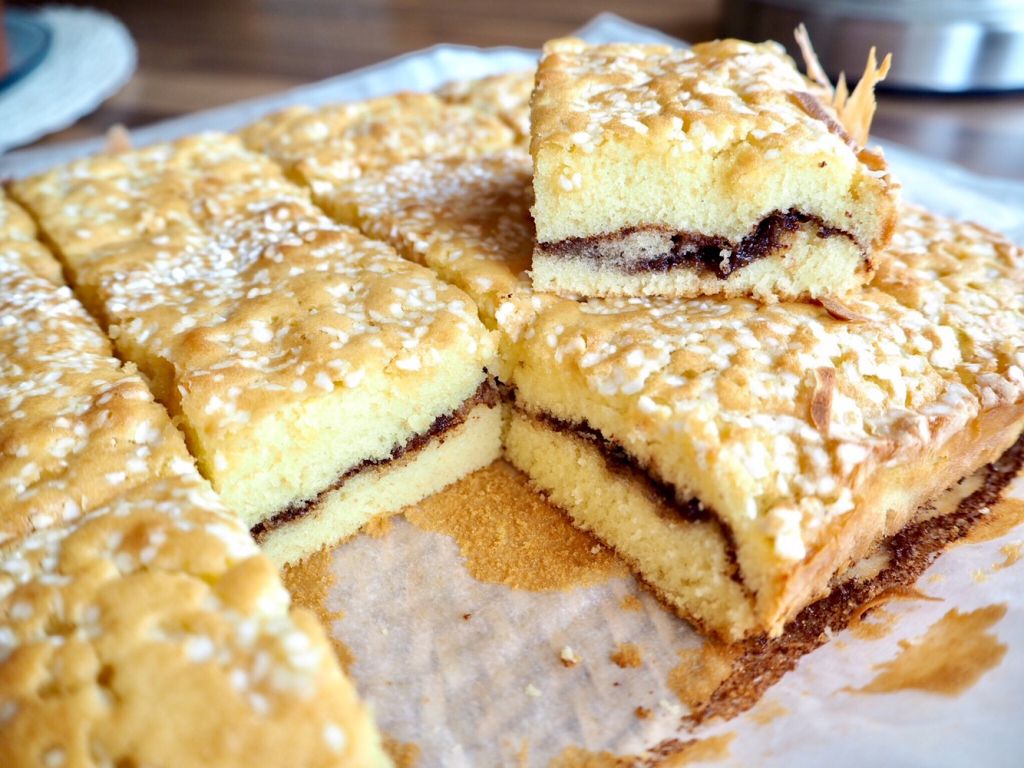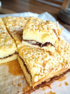 6) Häll i hälften av smeten. Blanda sedan kanel och socker och häll det över hela kakan. Häll sedan på resten av smeten och toppa med pärlsocker.