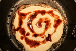 4) Stek pannkakorna i smör. Häll på lite av fyllningen i formationen av kanel i en kanelbulle. Tänk dig som en spiral. Tänk på att ha låg värme på stekpannan. Vänd pannakakan så den steks på båda sidor.