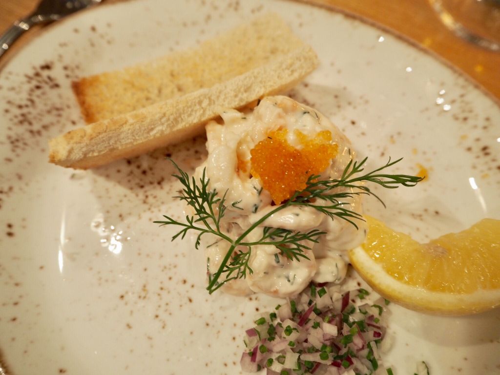 Några av förrätterna från kvällen. Matjestallrik och en toast Skagen.