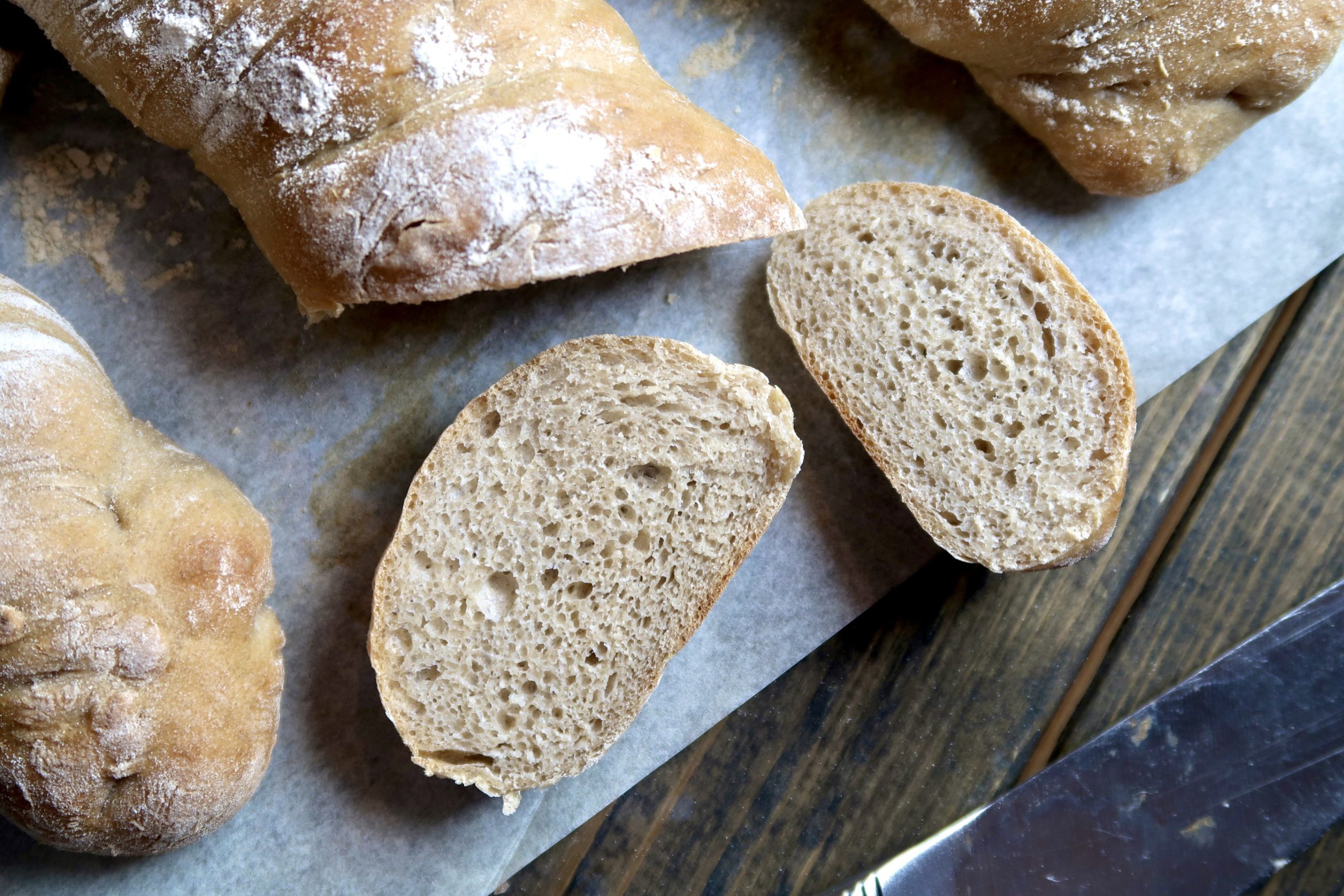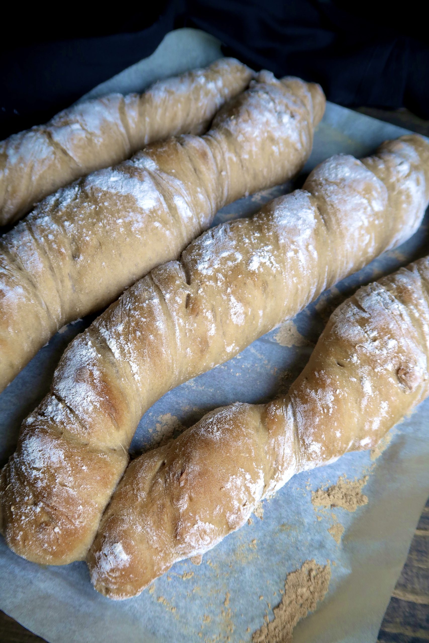 3) Ta upp degen på mjölat bord, men knåda den absolut inte. Rör den så lite som möjligt. Dela den i fyra delar. Forma till vridna baguetter och lägg dem på bakplåtsklädda plåtar. Pudra över lite mjöl och låt dem jäsa under duk cirka 30 minuter.