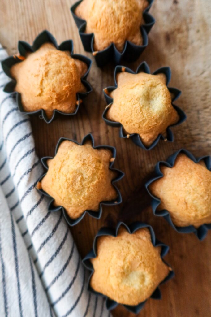 6) Fyll formarna till cirka 80 %. Baka i airfryer 10–13 minuter (kolla med sticka). I ugn: ca 10–12 minuter.